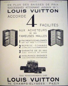 Je ne résiste pas au plaisir de vous montrer une publicité ancienne de la marque Louis Vuitton que j’ai croisé par hasard et sur laquelle on peut voir qu’à l’époque, celle-ci déployait des trésors de communication pour séduire la clientèle et vendre ses produits, y compris avec de fortes remises. vous remarquerez au passage que l’on hésitait pas à mettre du contenu écrit et notamment du service dans les publicités. Uujourd’hui, la plupart du temps, tout ( ou plutôt rien!) passe par l’image.
