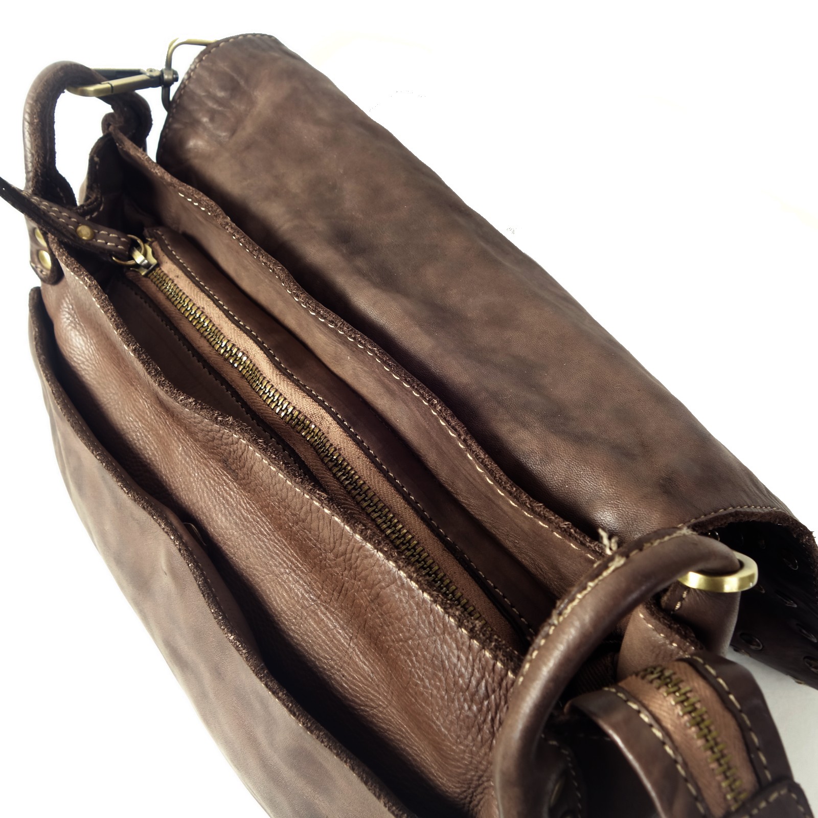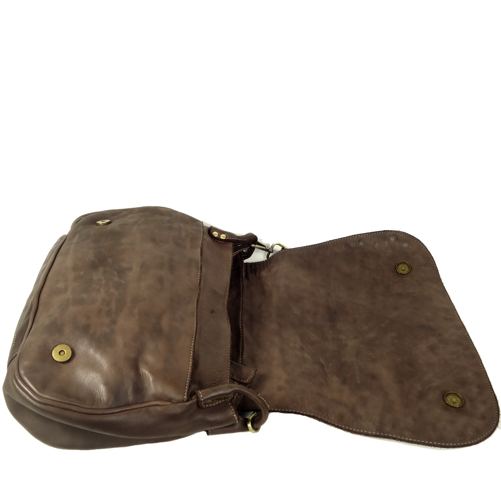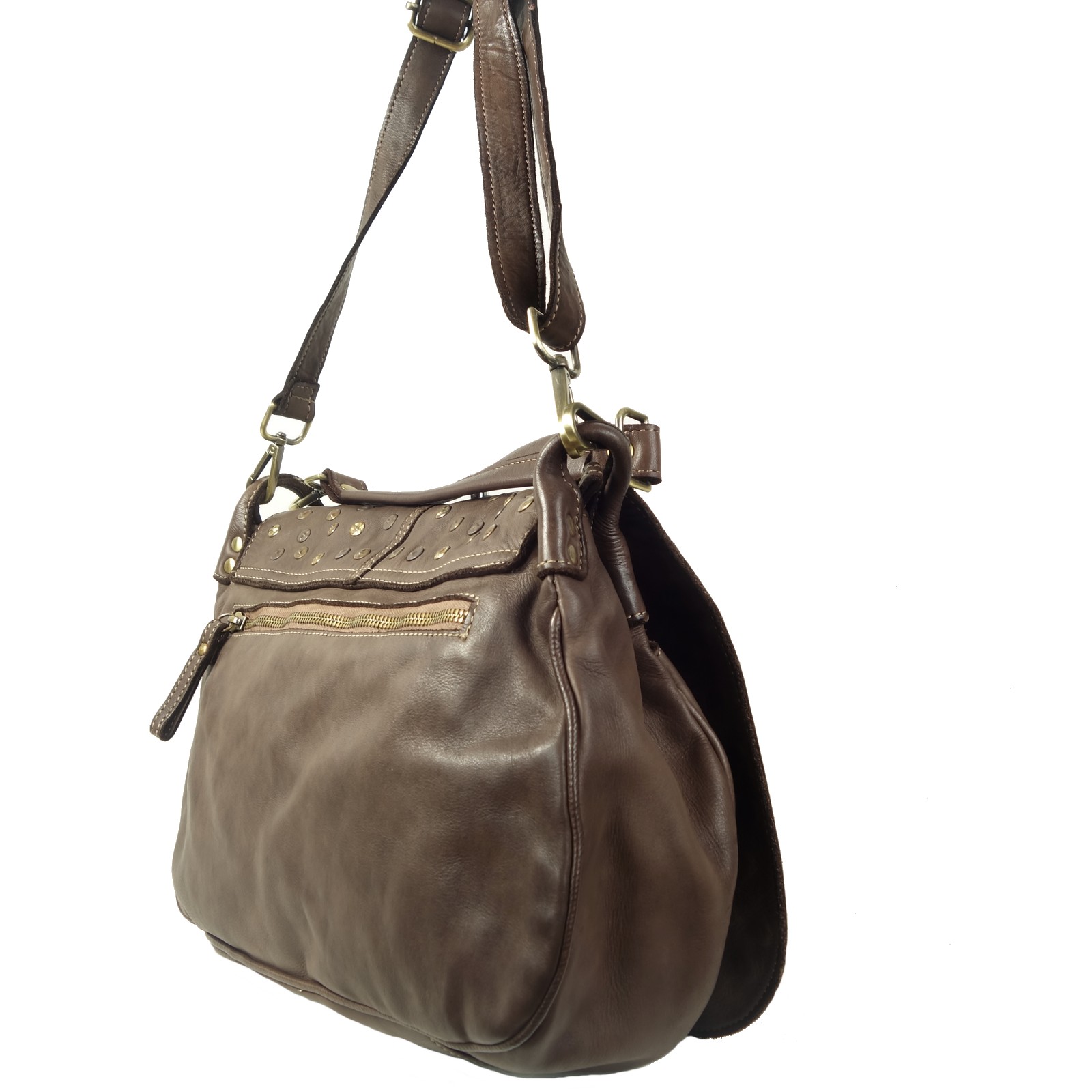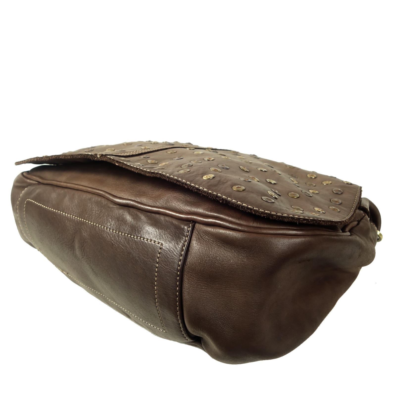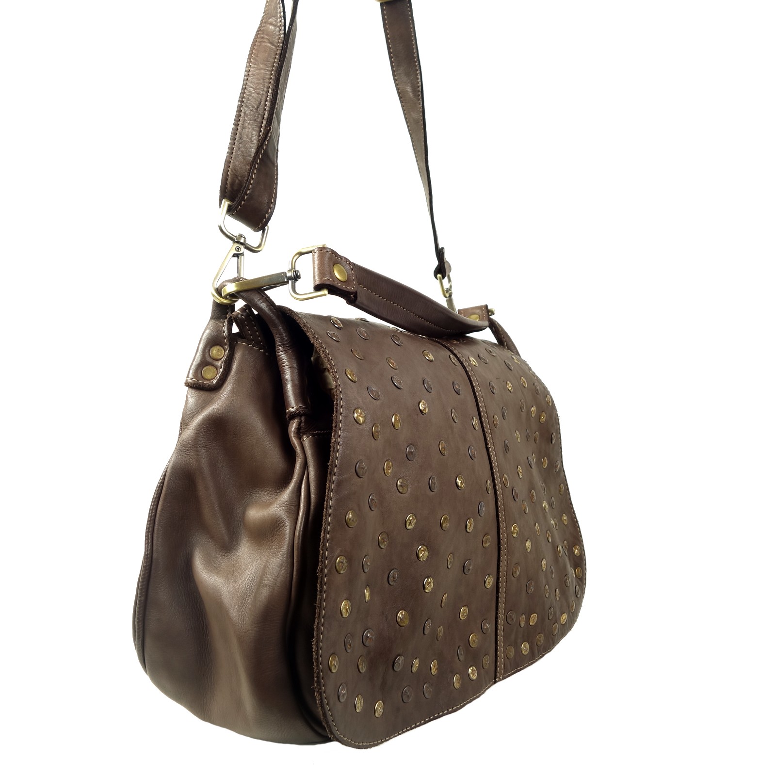 Ce modèle possède une ligne arrondie habillée de cuir vintage marron café, avec une myriade de petits clous métal martelé sur le rabat.
