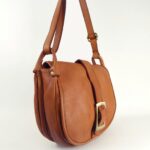 Ce sac à main affiche une ligne typique de besace ronde ornée d’une sangle décorative à grosse boucle dorée.