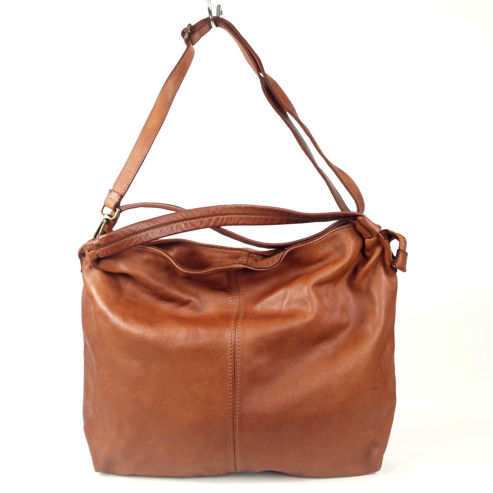 Ce grand sac à main se présente comme une large besace de format A4, en cuir souple vintage de couleur cognac.