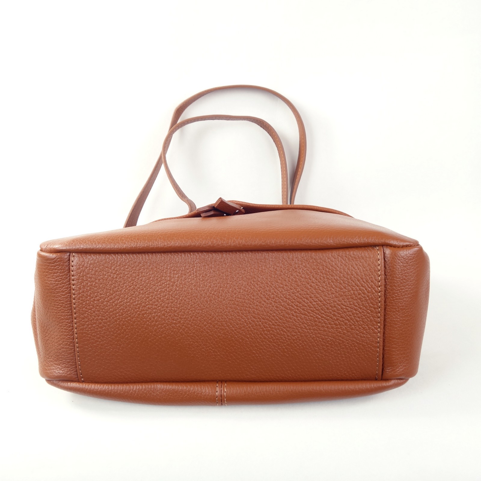 Le cuir est assez souple et légèrement grainé, teinté d’une couleur camel/marron clair assez neutre.