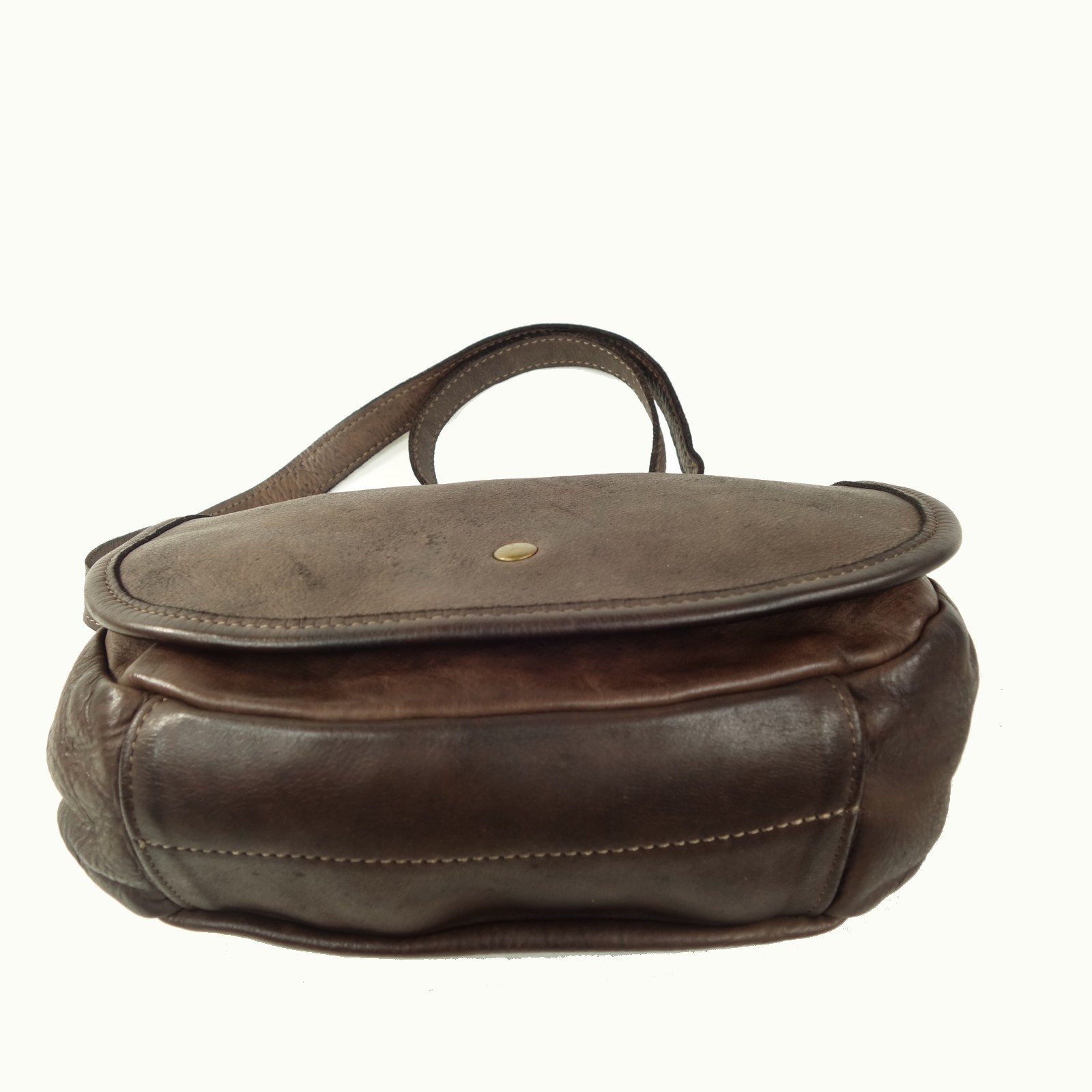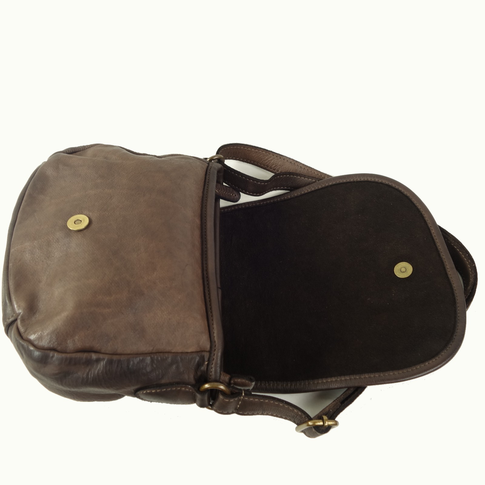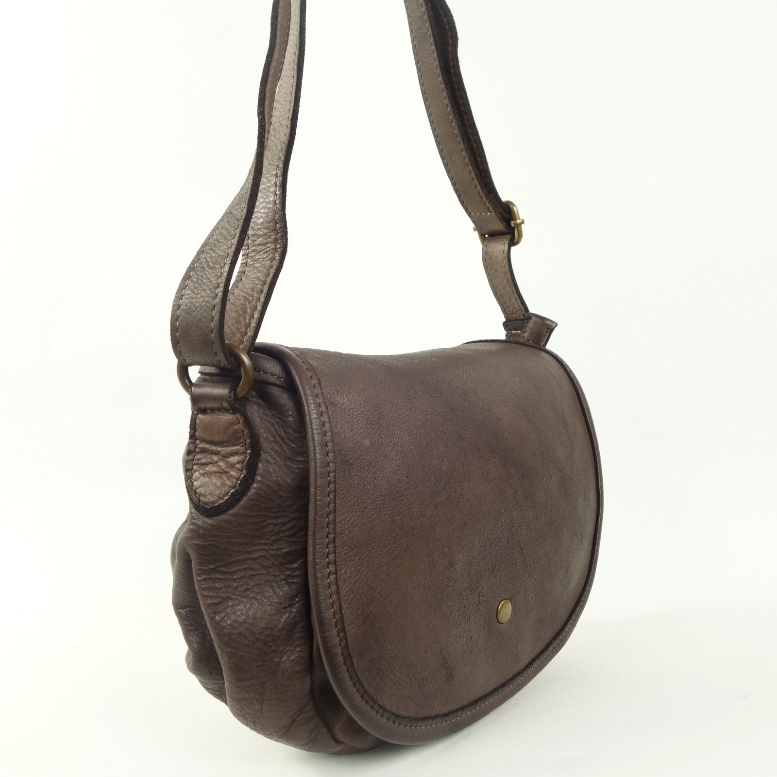 Ce modèle bénéficie d’un habillage en cuir vintage souple et patiné de couleur marron foncé . Le visuel de ce sac offre un effet authentique, un format medium et une qualité italienne artisanale.