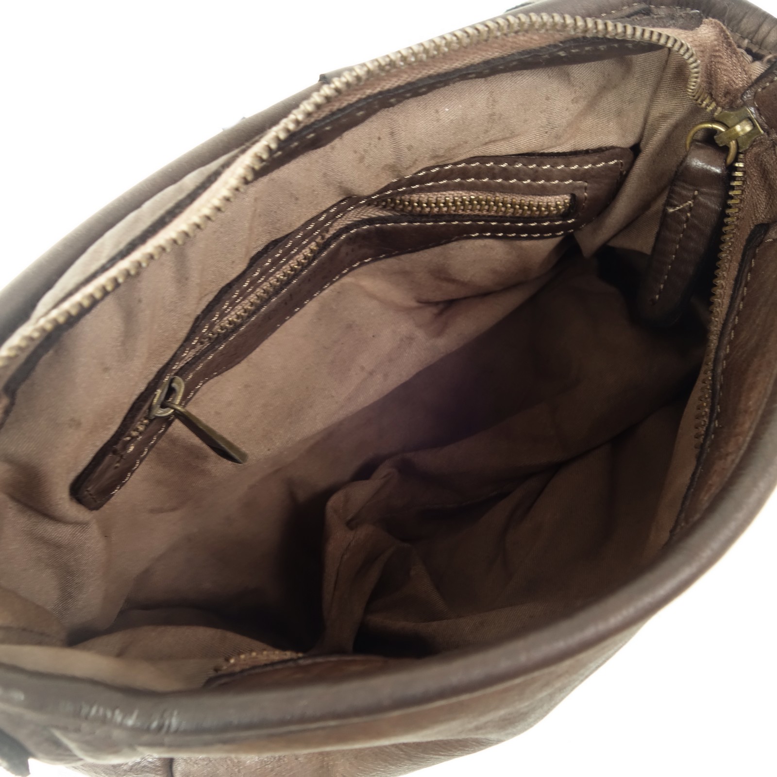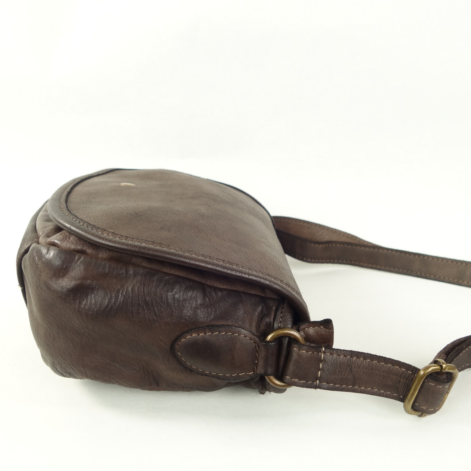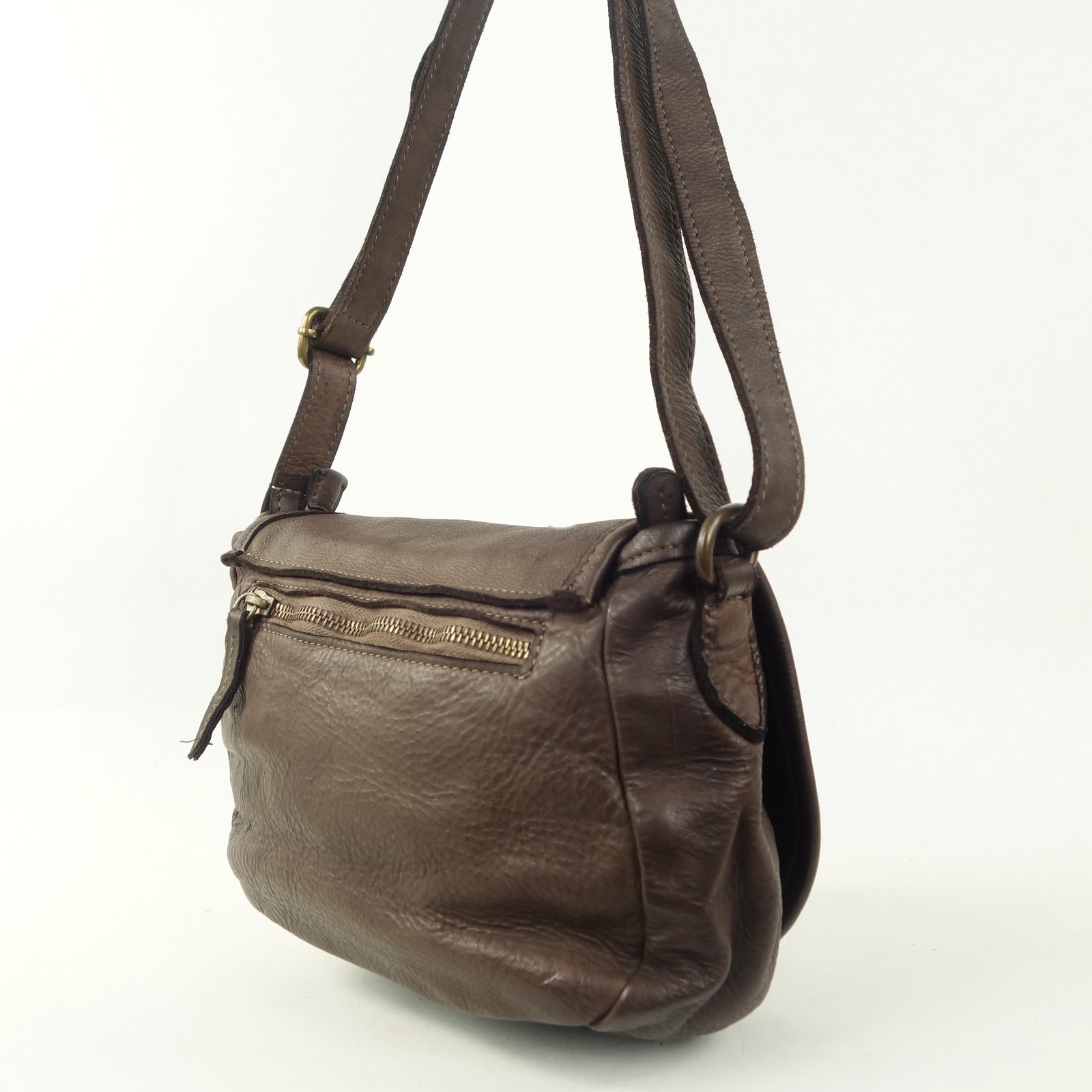 Ce modèle bénéficie d’un habillage en cuir vintage souple et patiné de couleur marron foncé . Le visuel de ce sac offre un effet authentique, un format medium et une qualité italienne artisanale.
