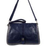 La ligne de grande pochette plate avec rabat se montre classique mais néanmoins habilement arrangée par un traitement inspiré avec bordure de clous plats en métal pour une touche de mode actuelle.