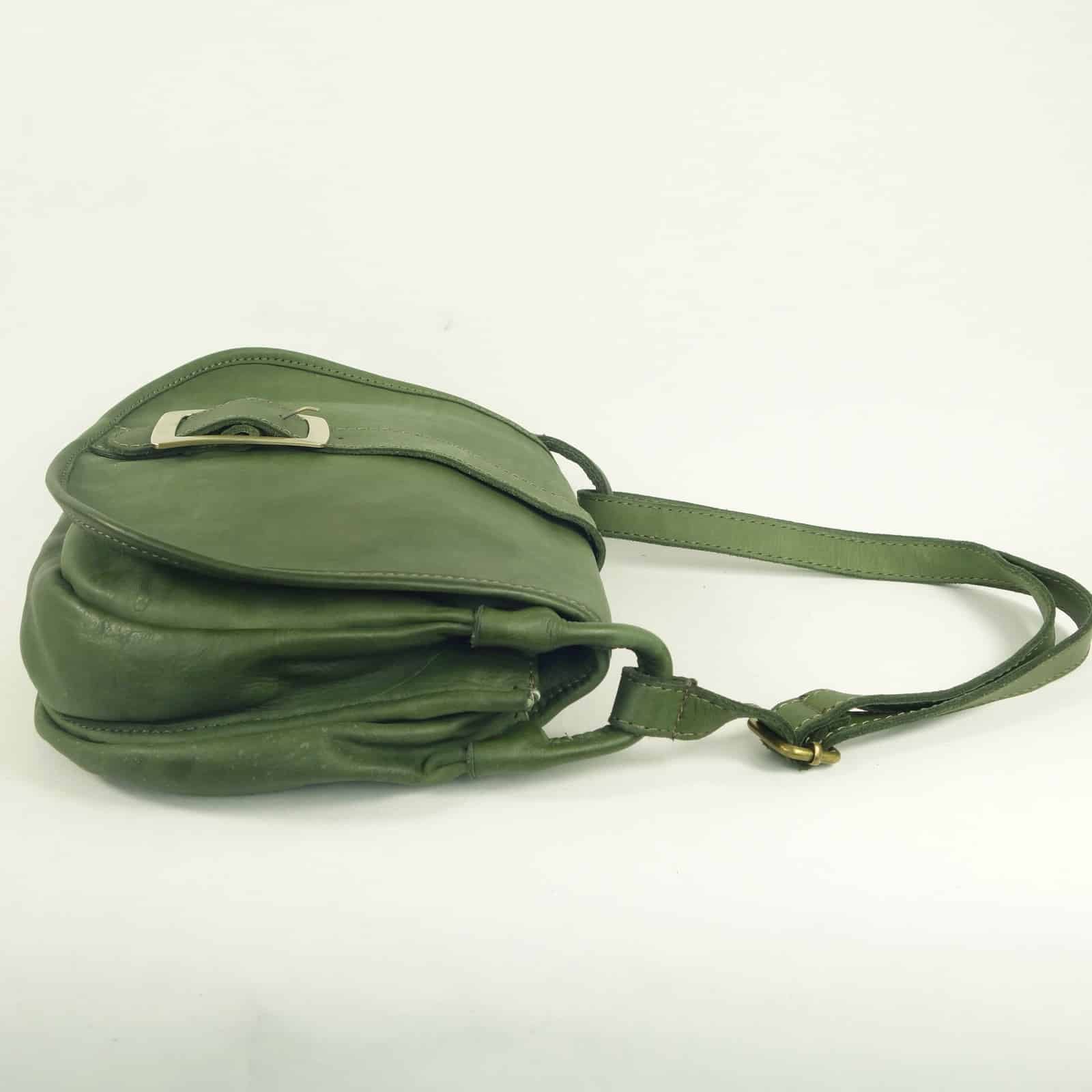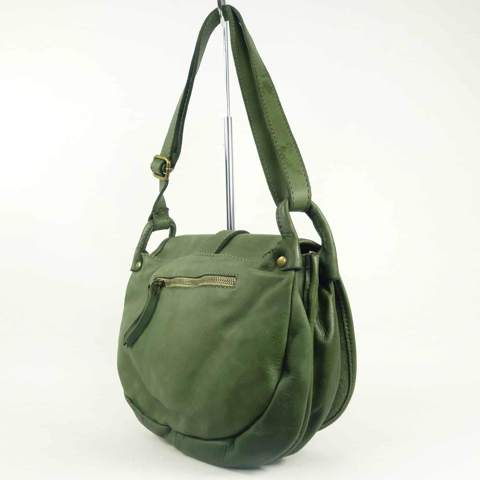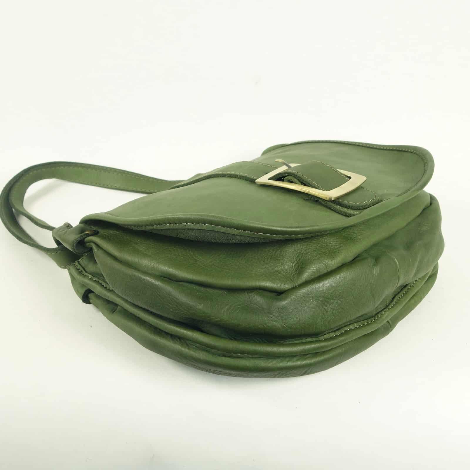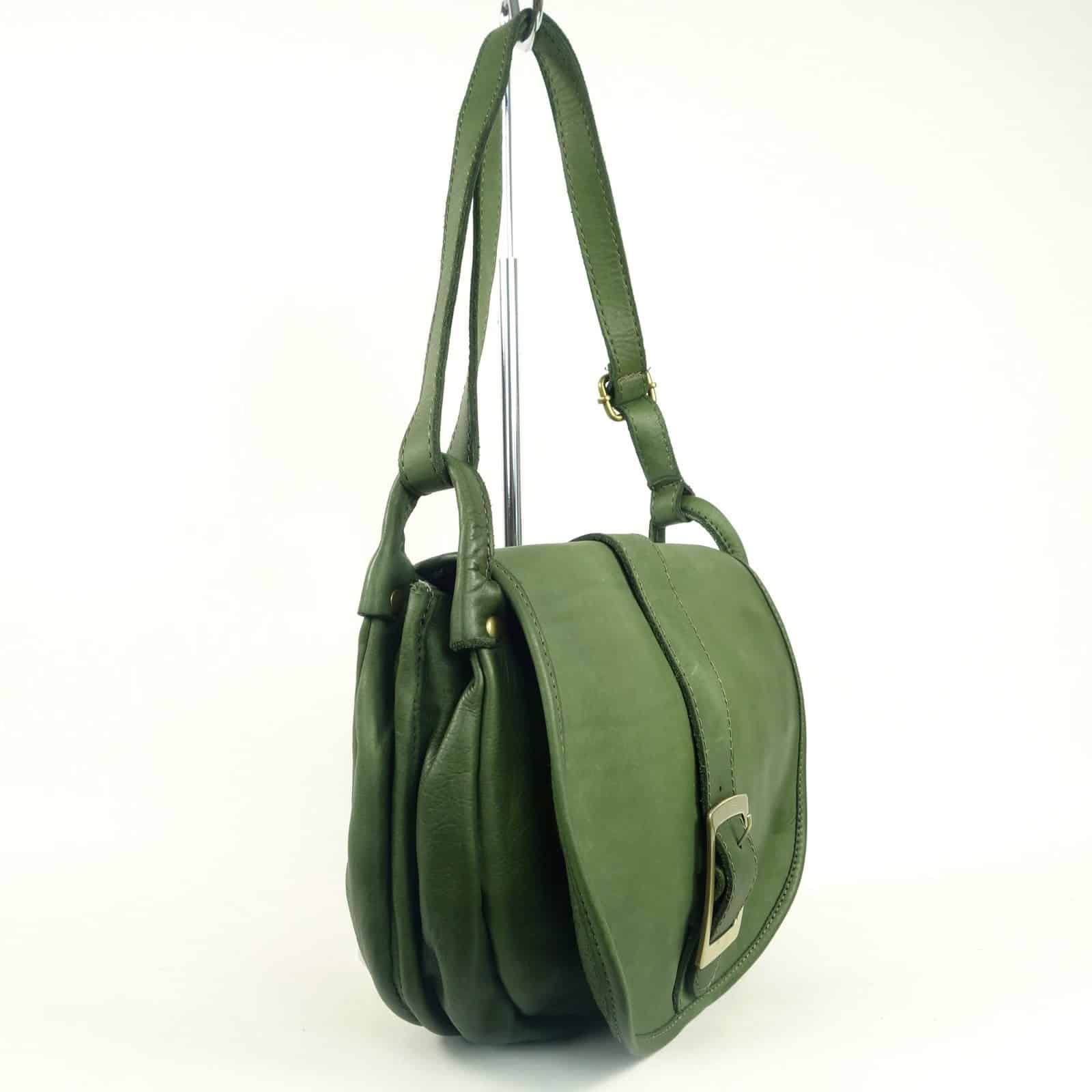 Ce sac à main bandoulière affiche la ligne typique de la besace ronde avec rabat pour femme, orné en façade d’une sangle décorative à grosse boucle dorée; il est en cuir souple avec effet vintage bien patiné de couleur vert foncé.