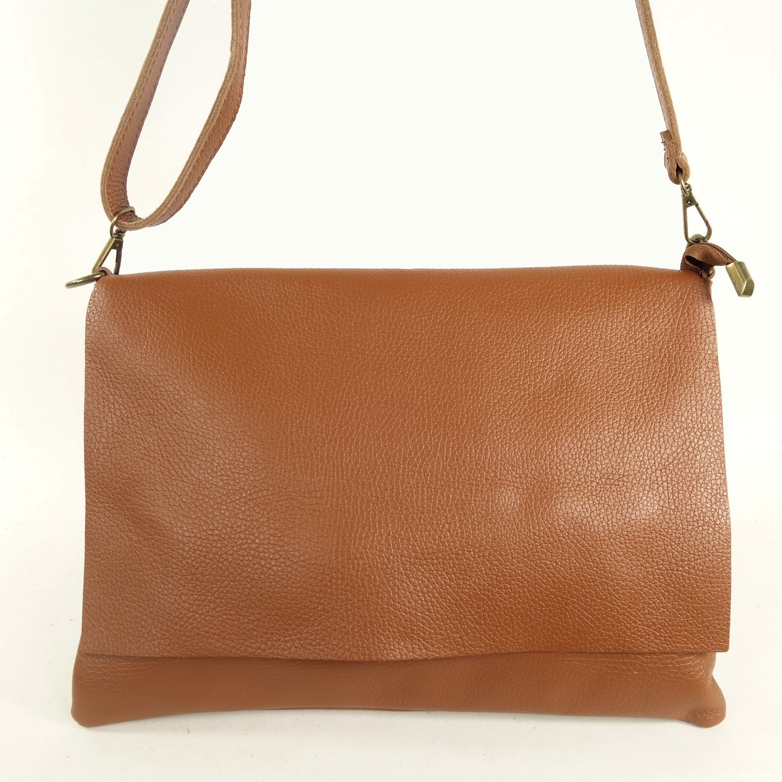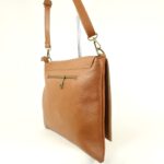 Cette grande pochette plate à rabat est un sac bandoulière femme en cuir souple teinté d’une jolie couleur camel foncé.