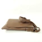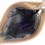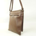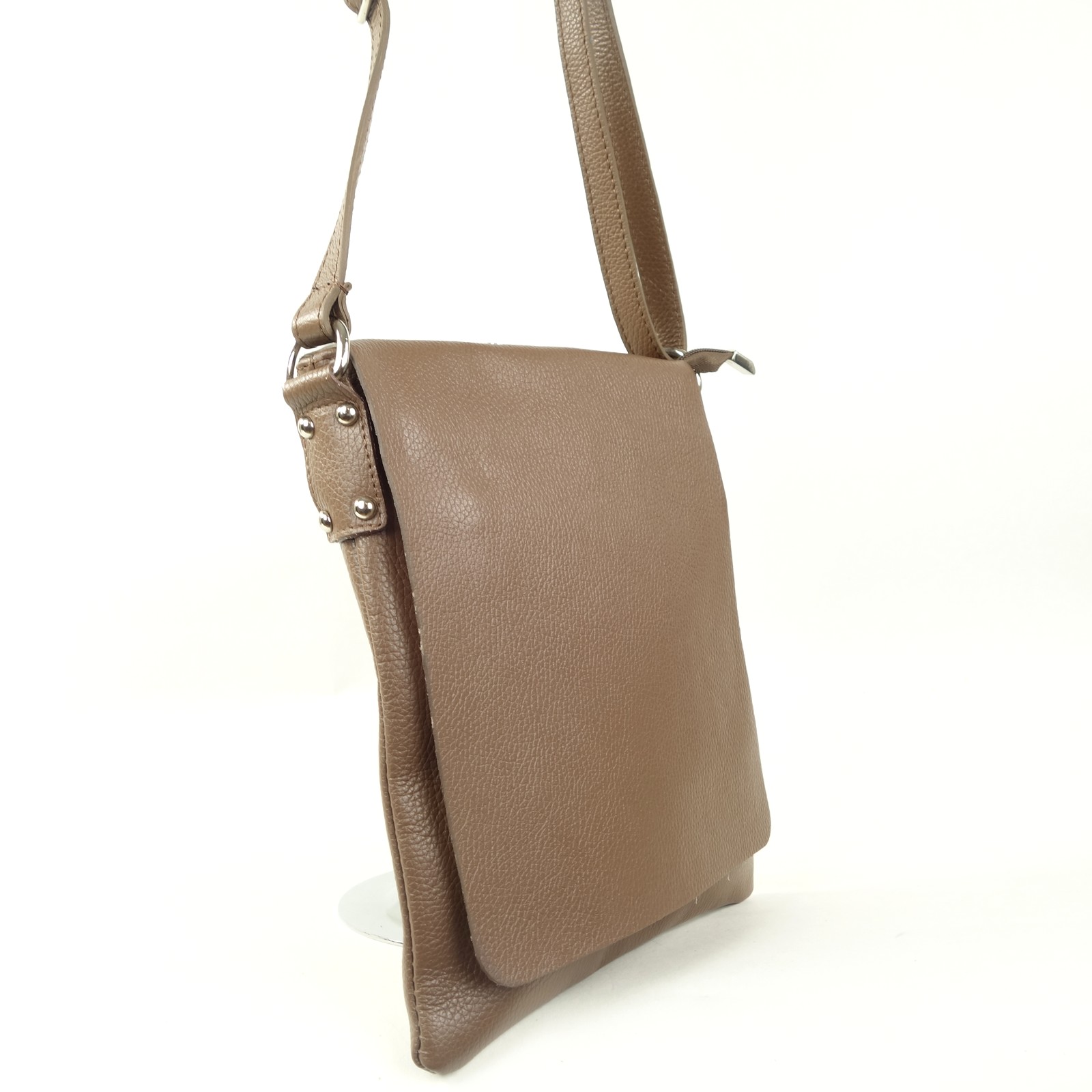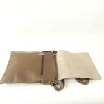 Ce sac bandoulière de style pochette plate pour femme est en cuir grainé souple de couleur taupe. Il se porte en travers ou à l’épaule.