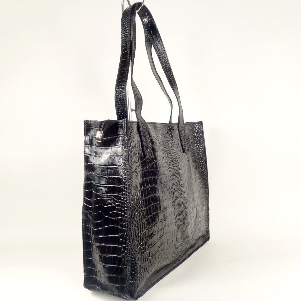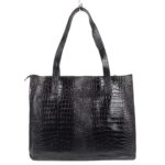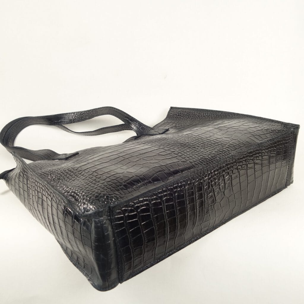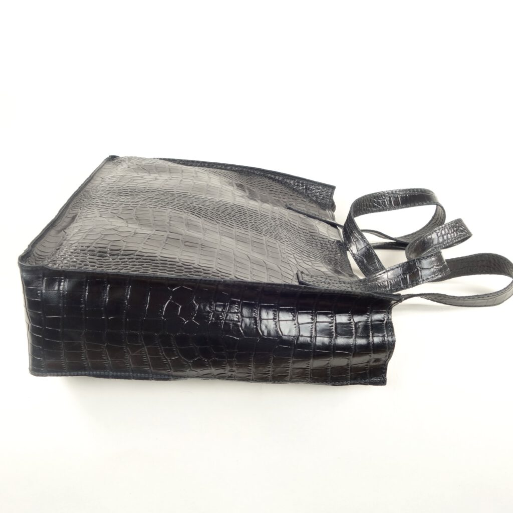 Il est fait avec un véritable cuir souple effet croco de couleur noir. Avec ses deux grandes anses et son format A4 à profil fin, il a une allure aussi chic que discrète.