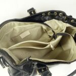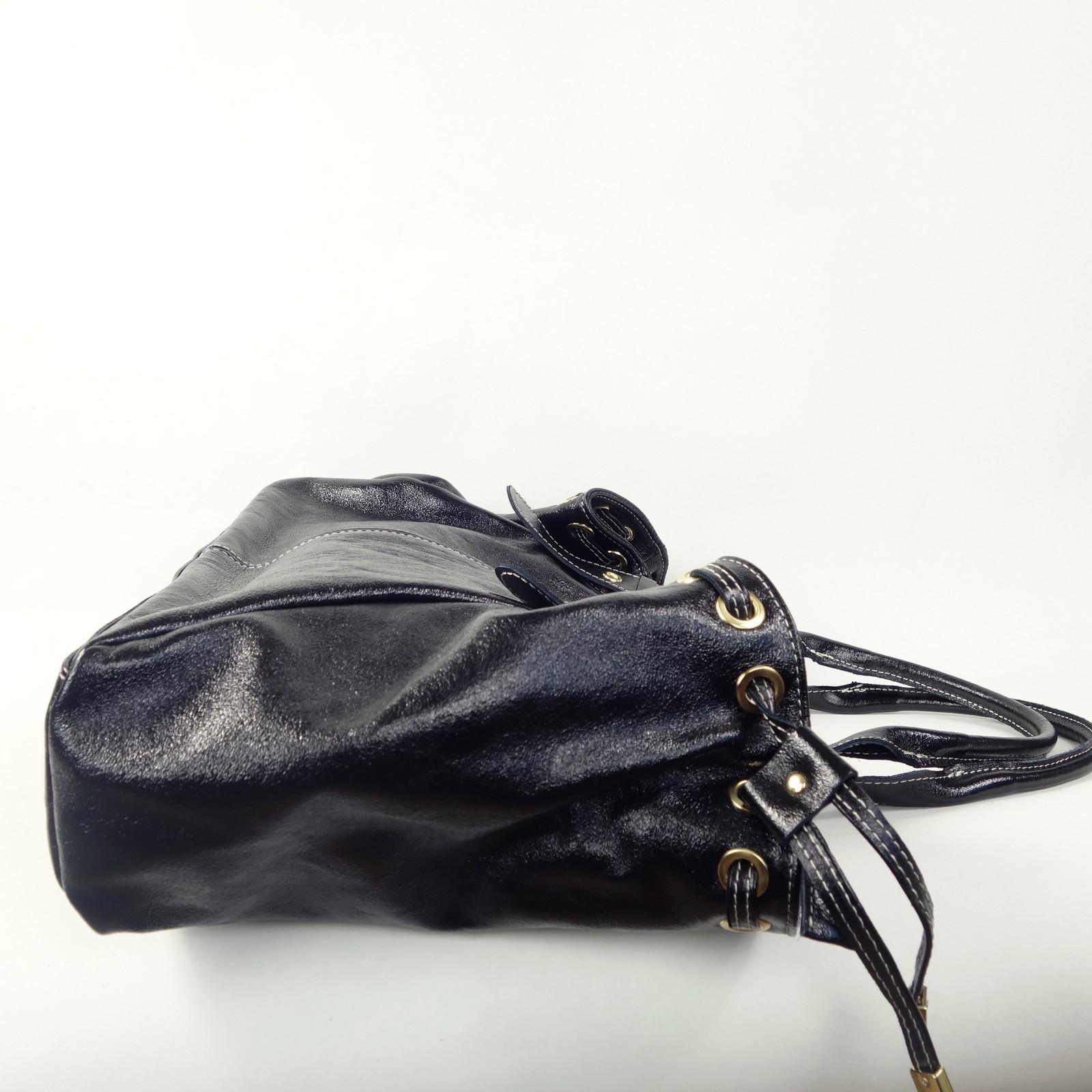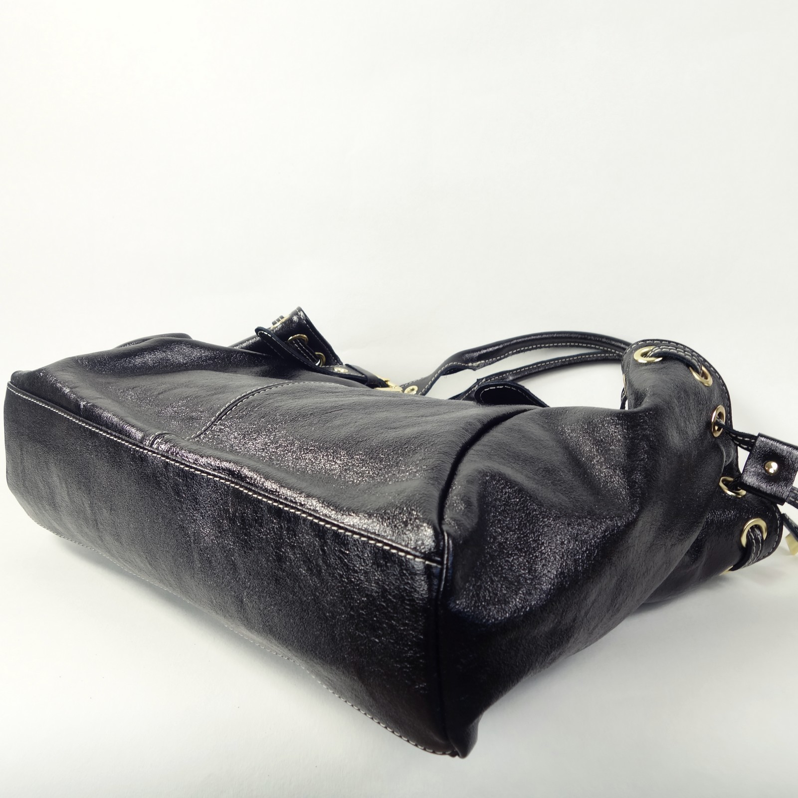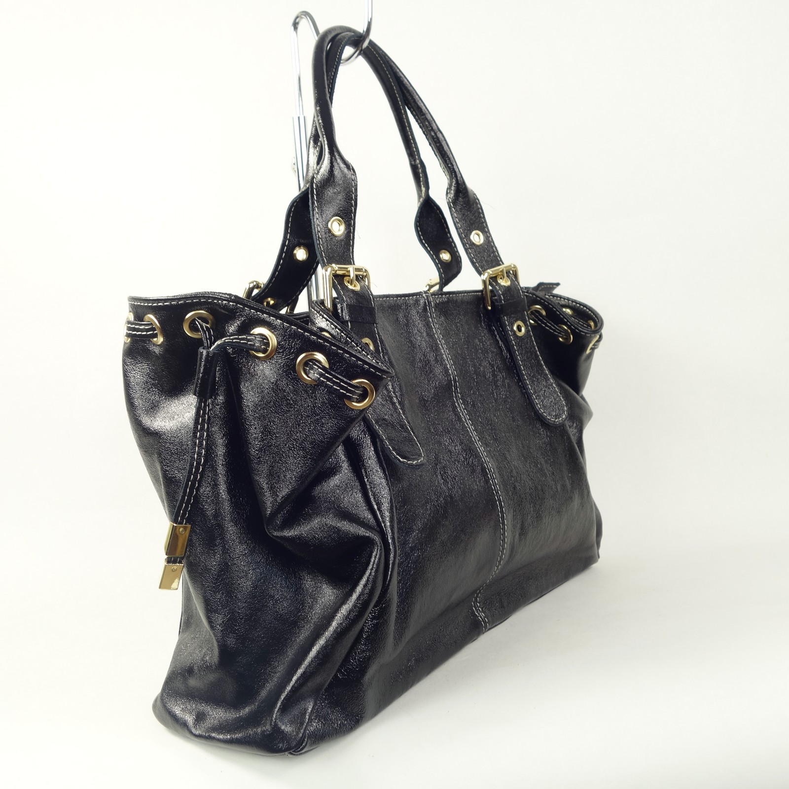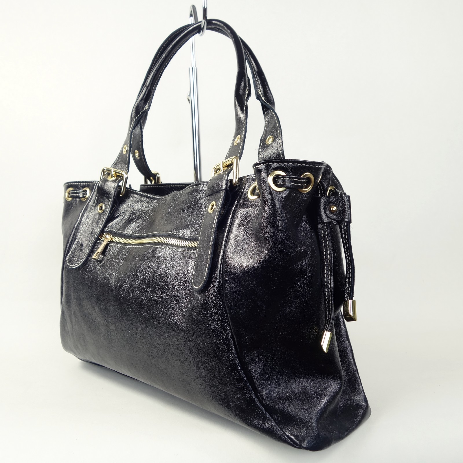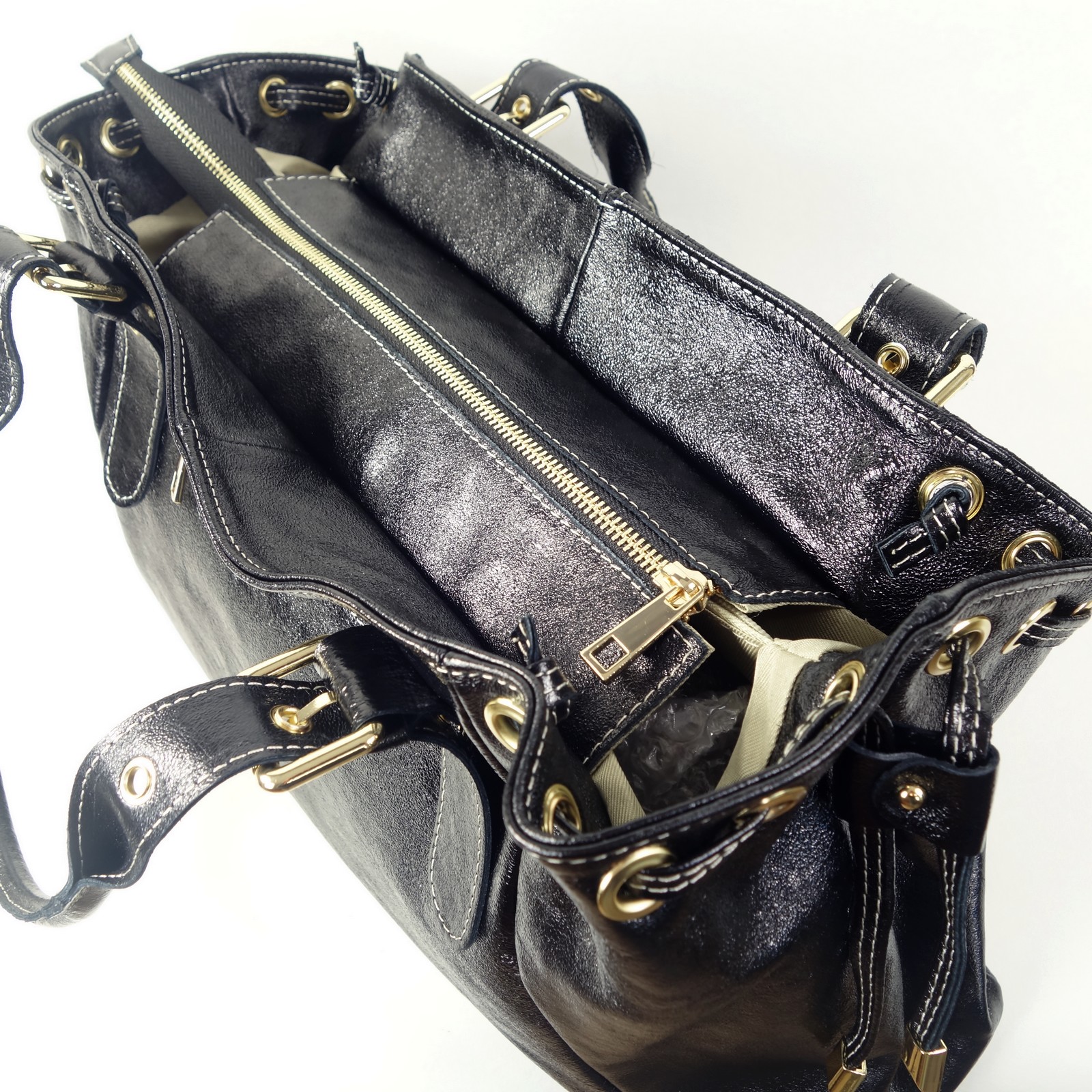 Peut être allez-vous craquer pour l’esprit rock et tendance ce grand sac à main en cuir irisé de couleur noir au style de cabas moderne.