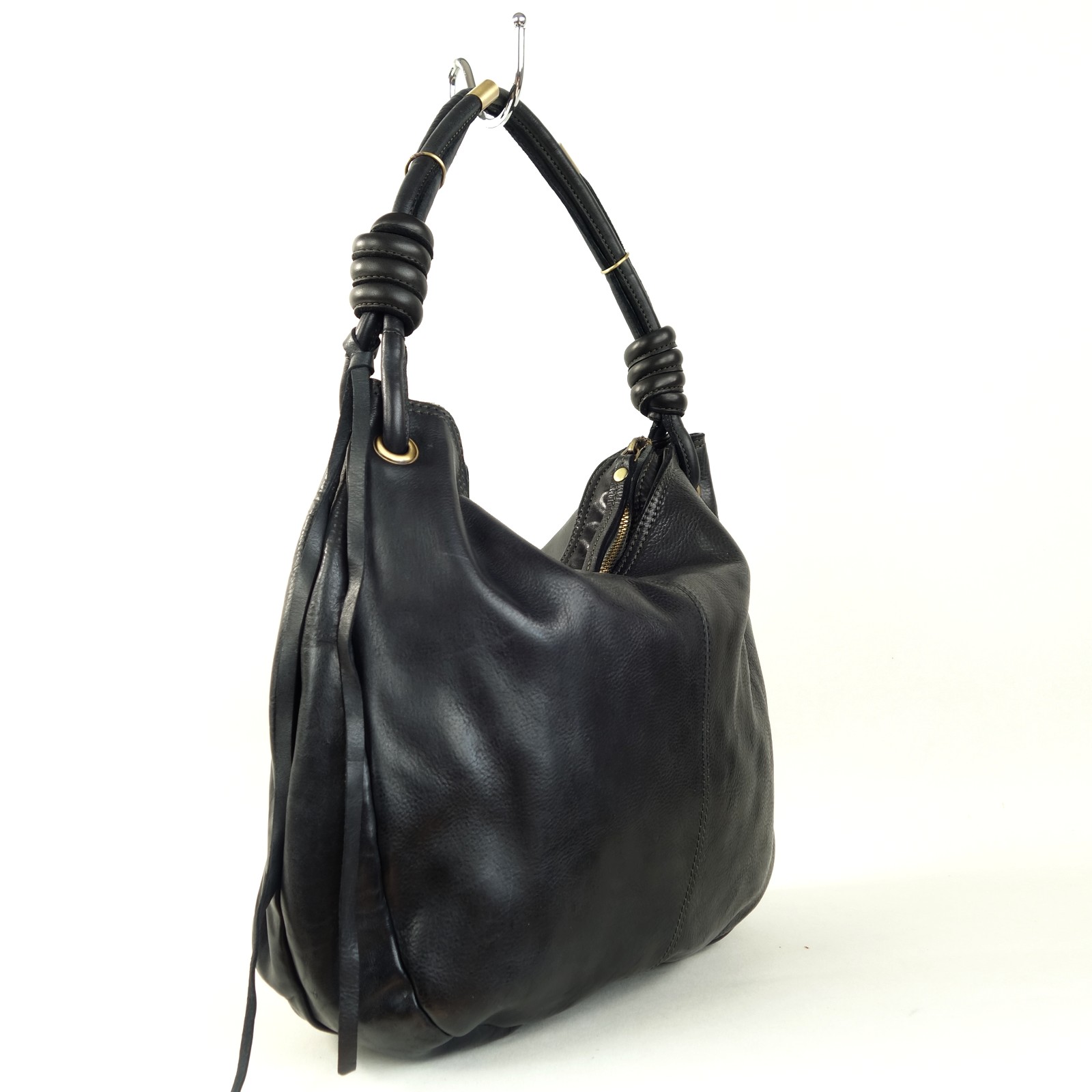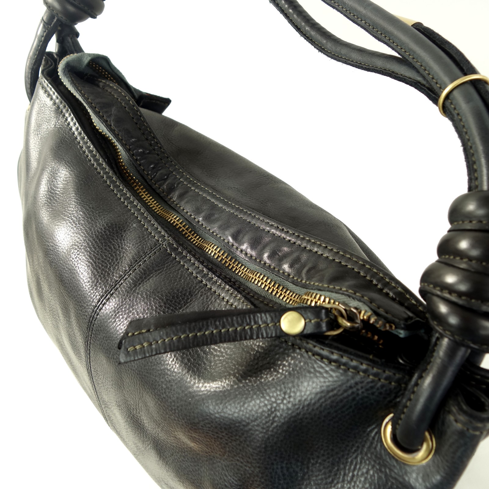 Ce modèle se porte principalement à l’épaule, comme un hobo, éventuellement à la main ou au bras. La fermeture de la partie interne est un zip classique avec curseur et tirette.