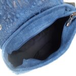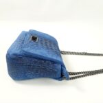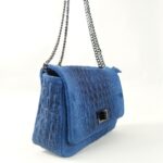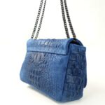 Ce petit sac femme en cuir nubuck impression croco en relief est de couleur bleu jean mat. Il se porte en bandoulière ou à l’épaule avec sa chaine métal coulissante.