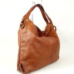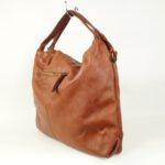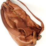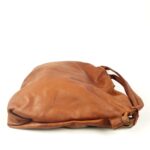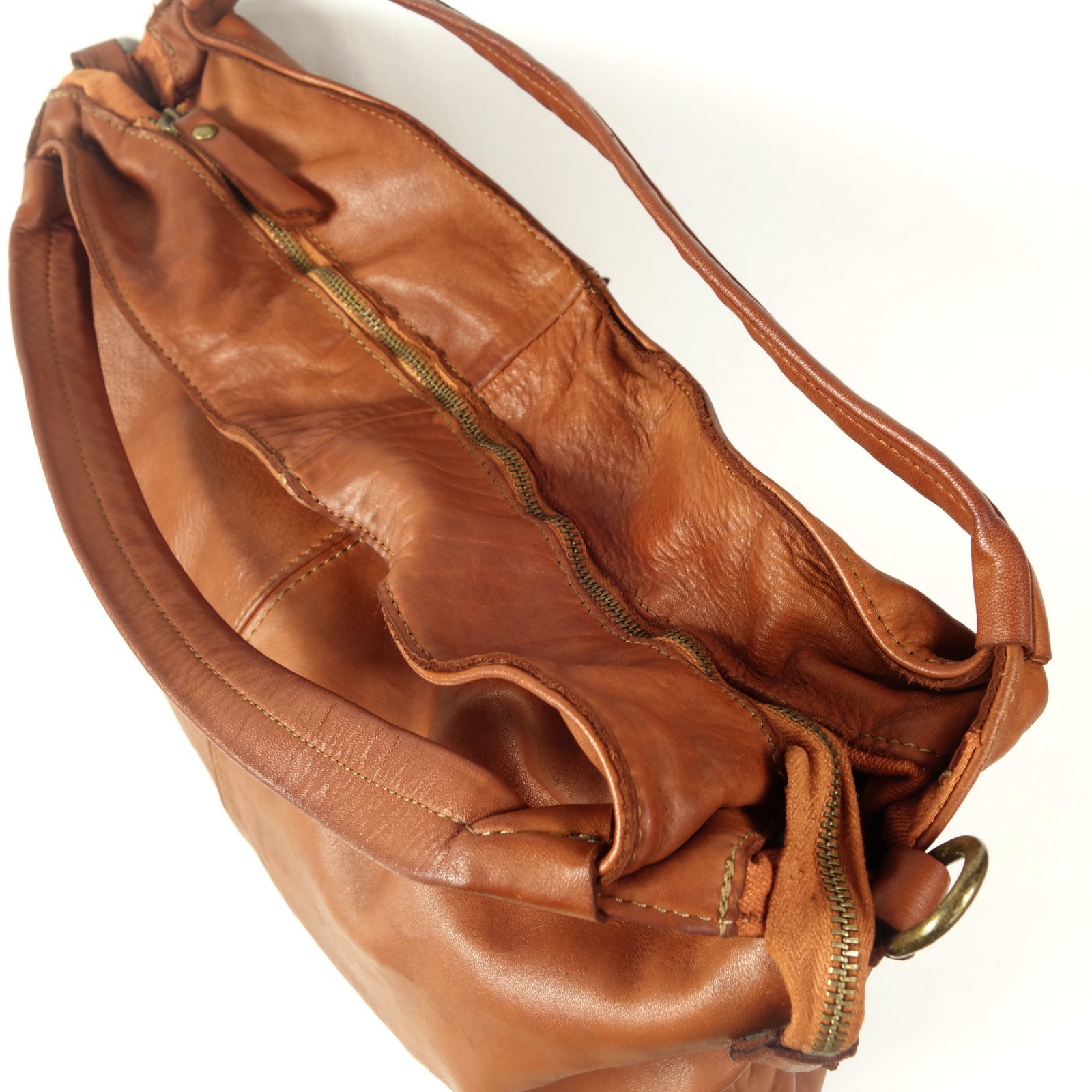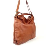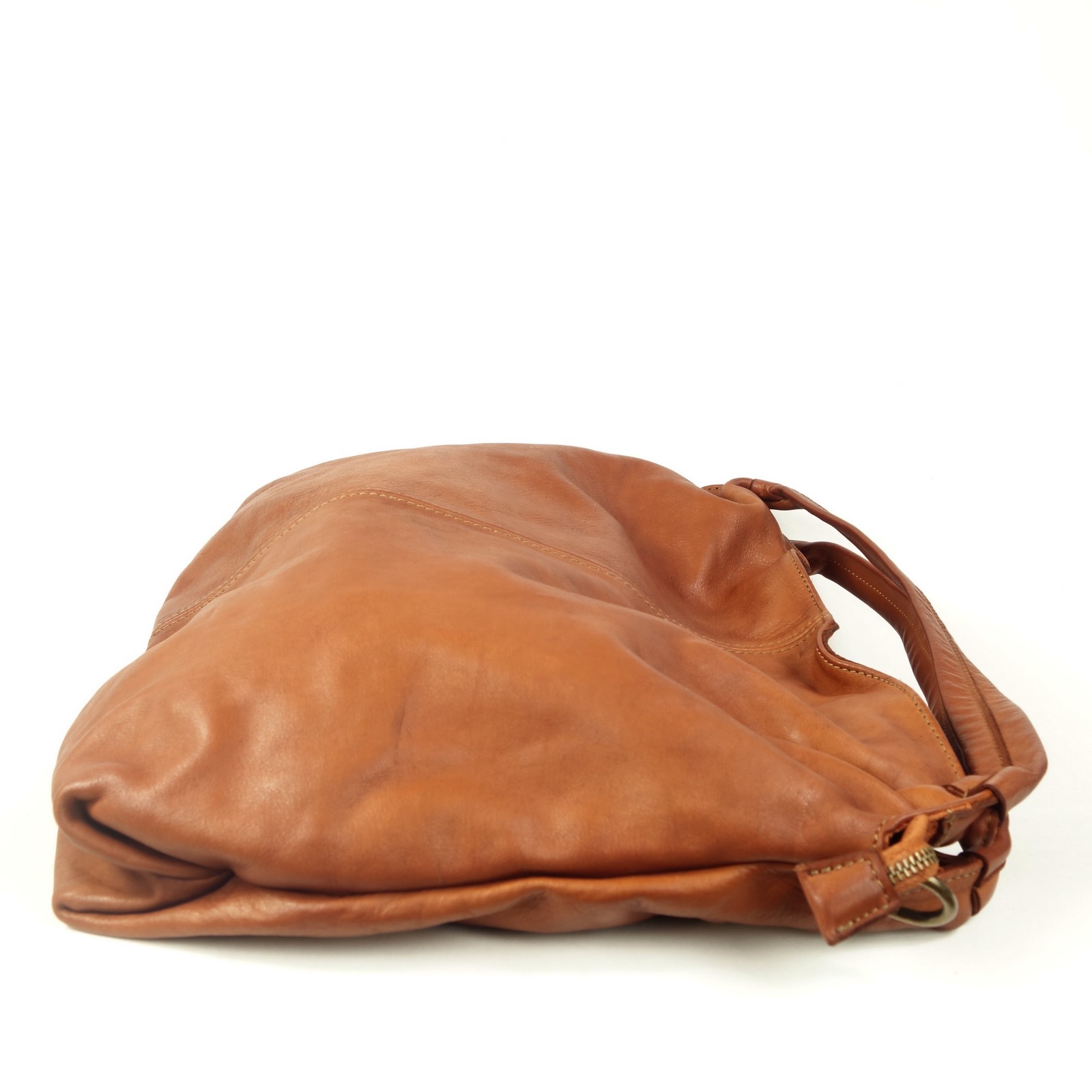 Ce grand sac à main se présente comme une large besace de format A4, en cuir souple vintage de couleur cognac.