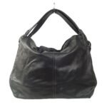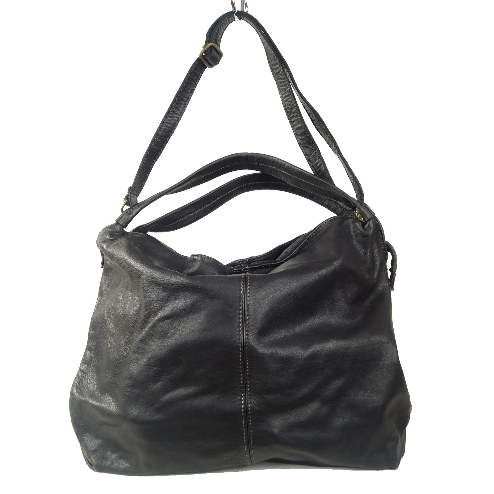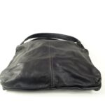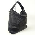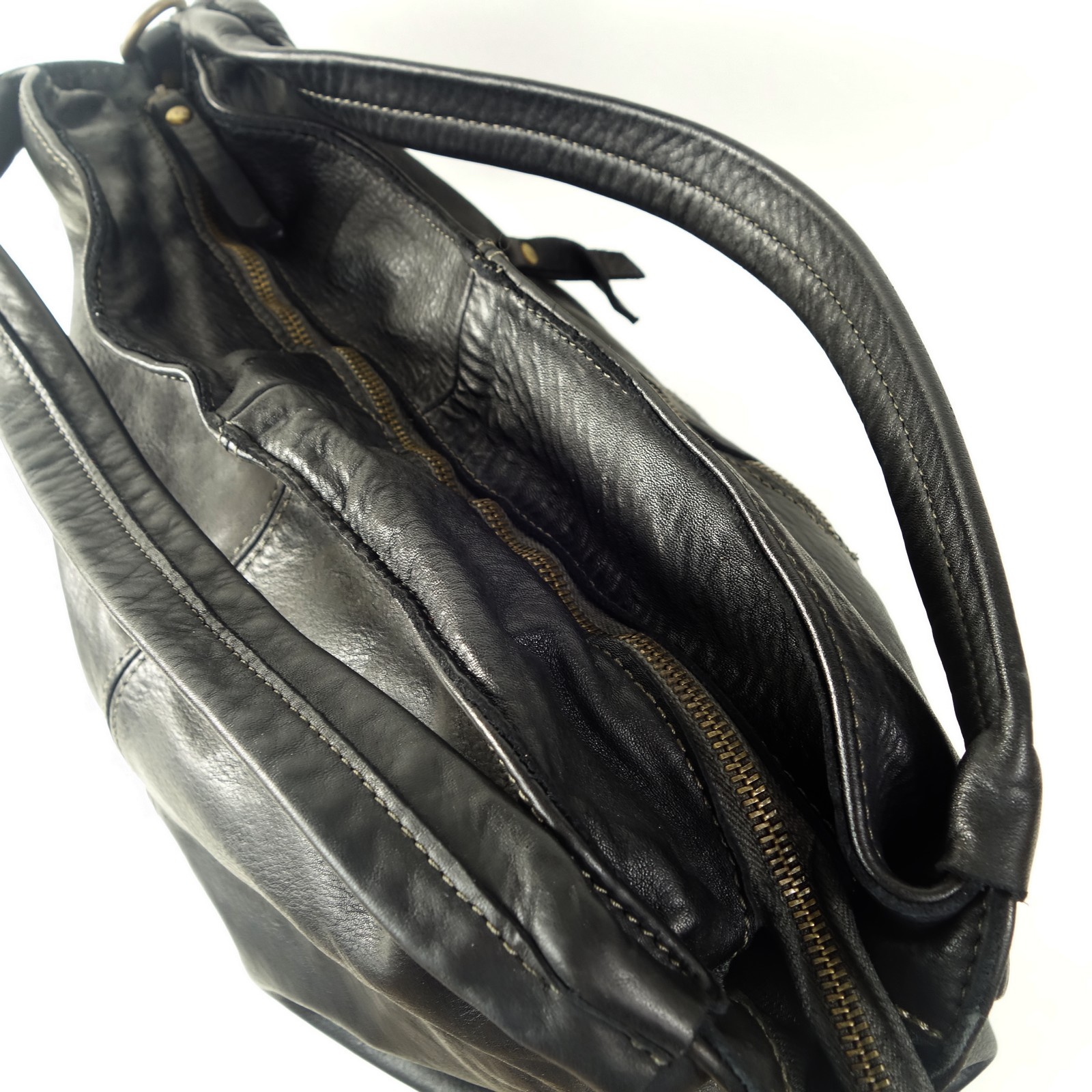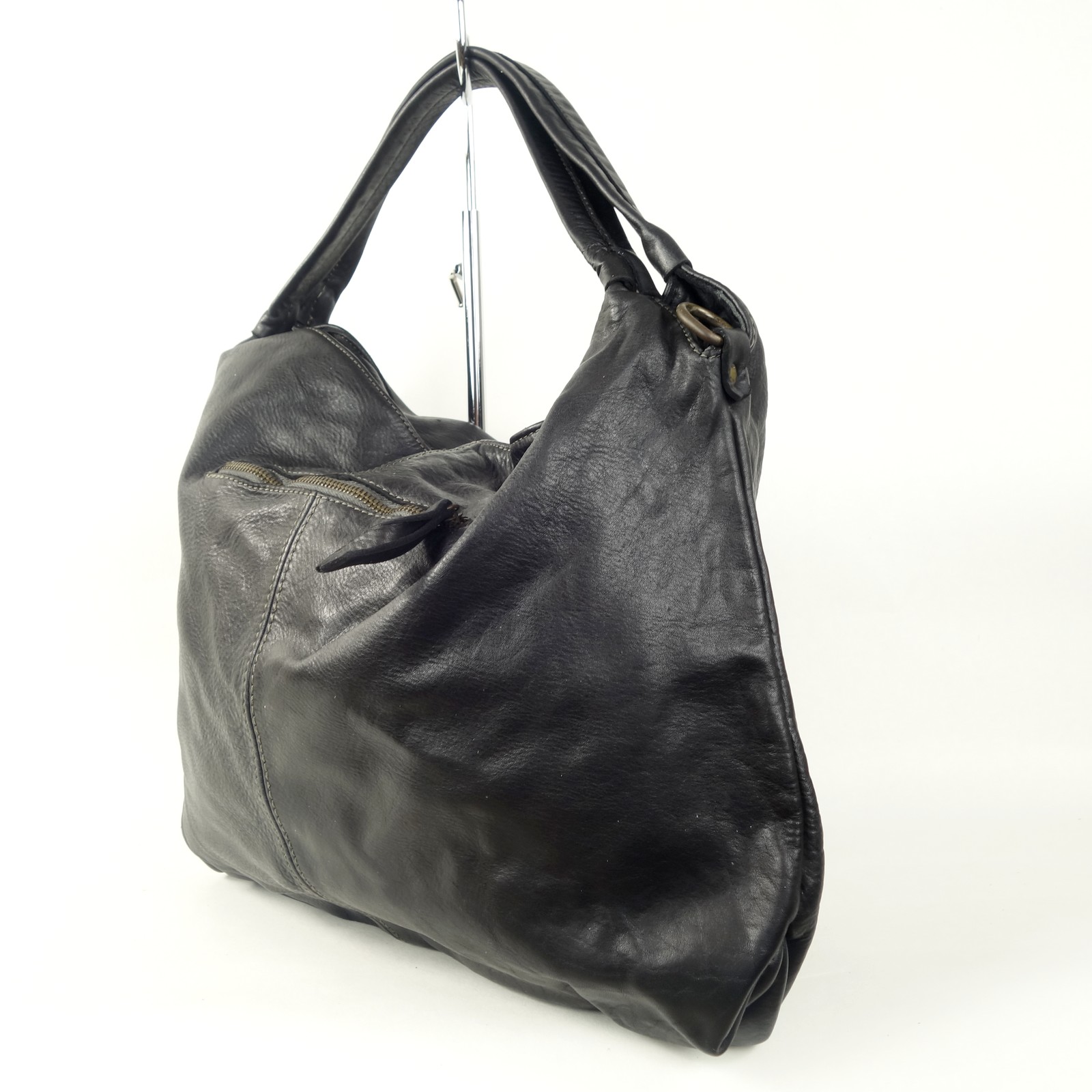 Ce grand sac à main adopte la forme d’une besace de format A4, en cuir souple finition vintage de couleur noir.