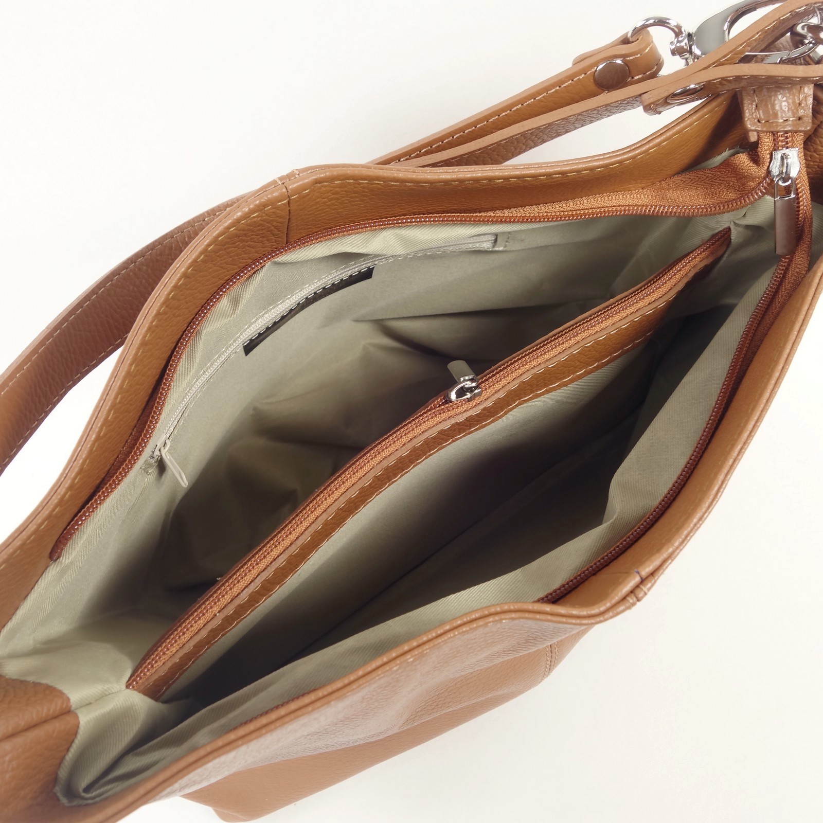 Une large ouverture zippée permet d’accéder à un espace intérieur doublé de textile et  conçu en deux compartiments distincts.