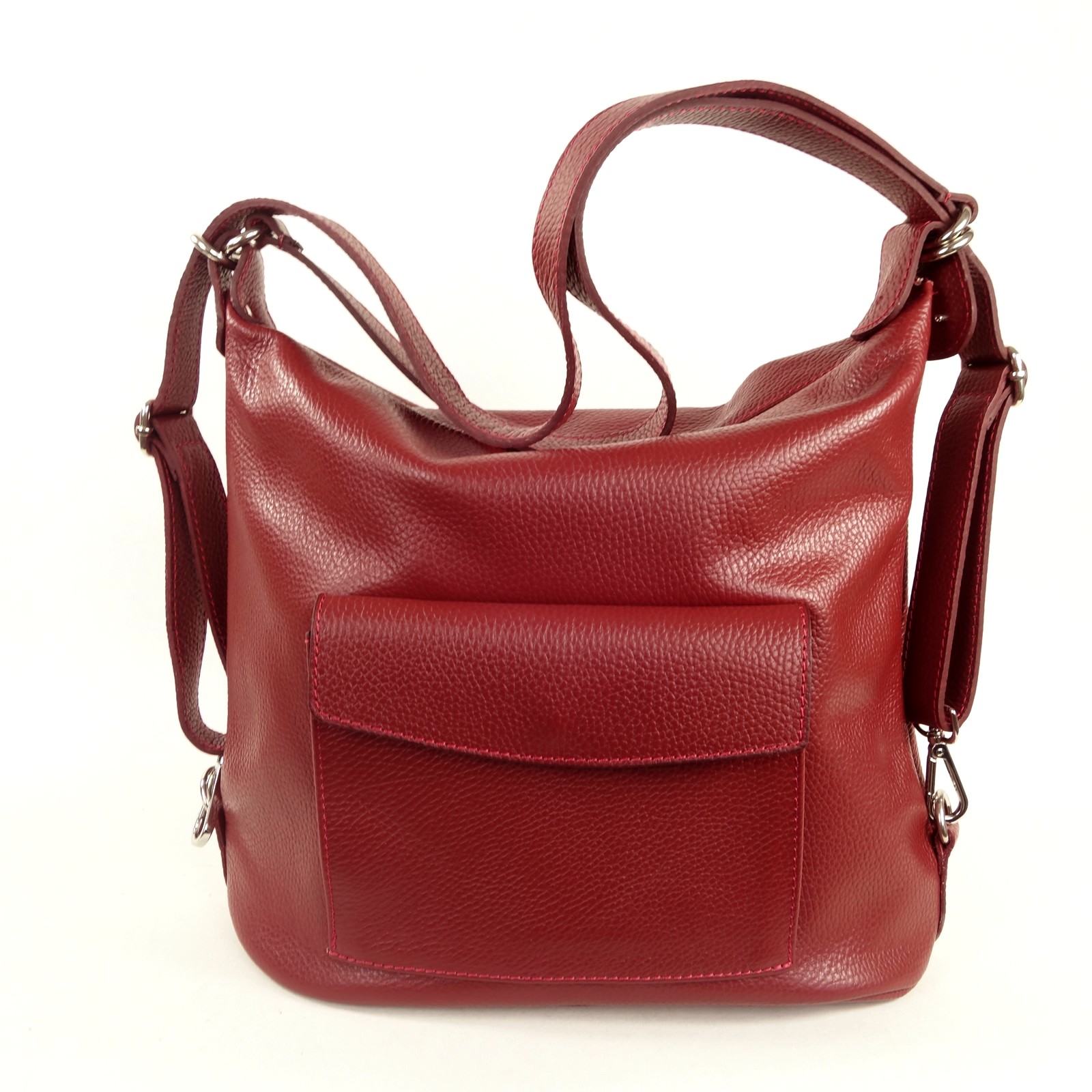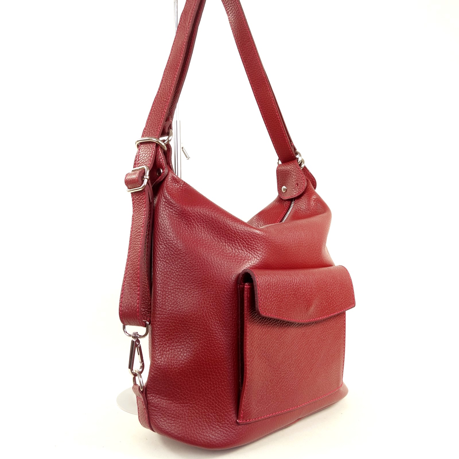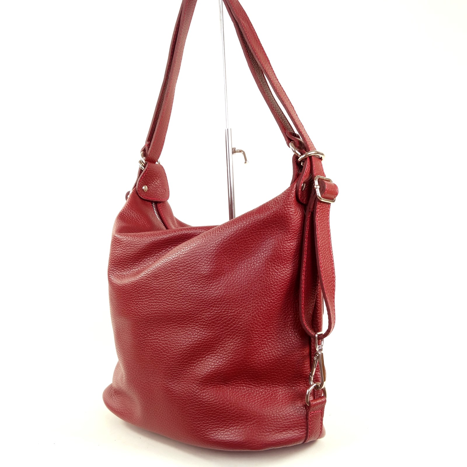 Ce sac à main en cuir grainé de couleur rouge propose un concept original. Il est à la fois un sac porté épaule qui peut se convertir rapidement en sac à dos.