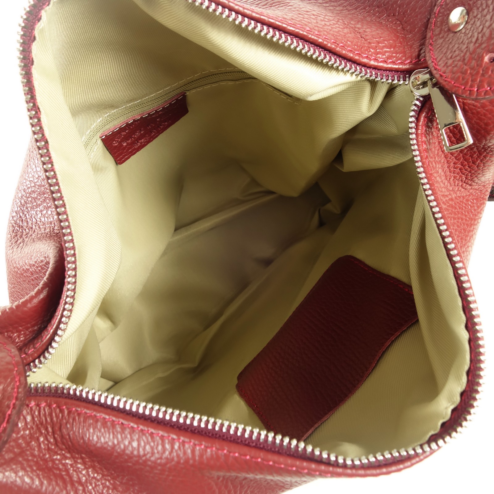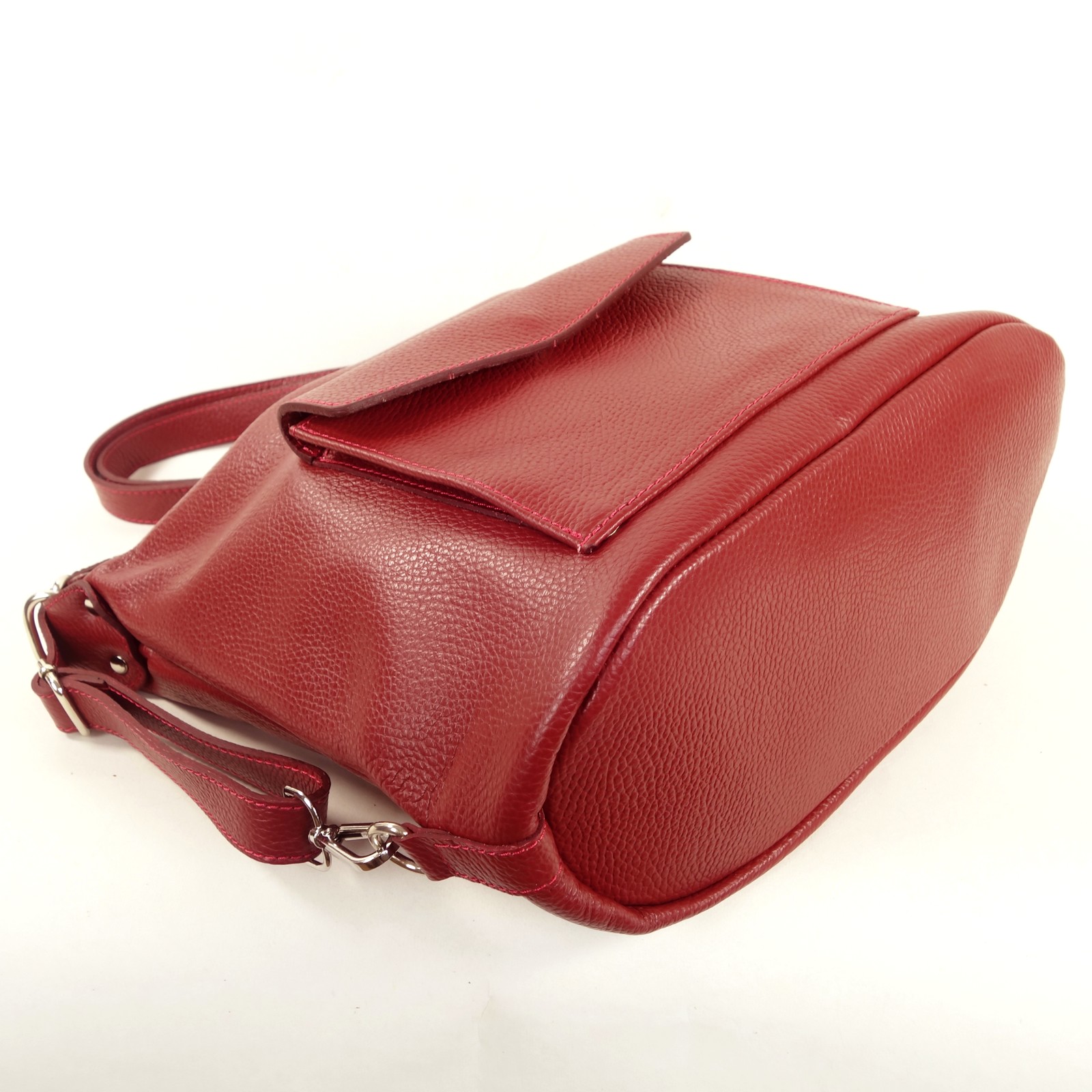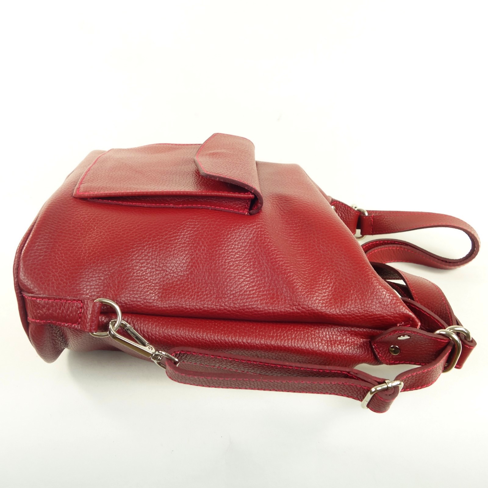 Ce sac à main en cuir grainé de couleur rouge propose un concept original. Il est à la fois un sac porté épaule qui peut se convertir rapidement en sac à dos.