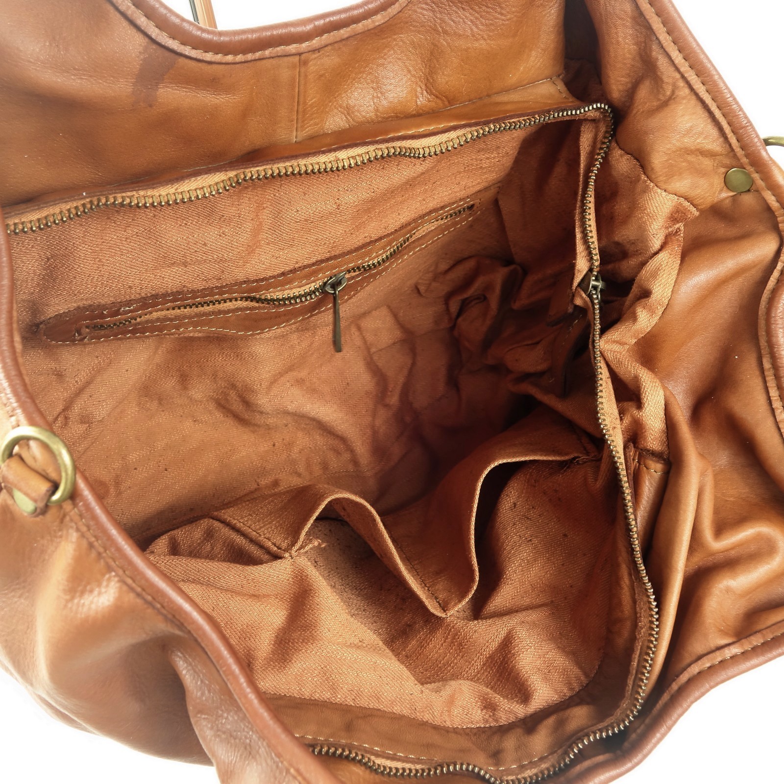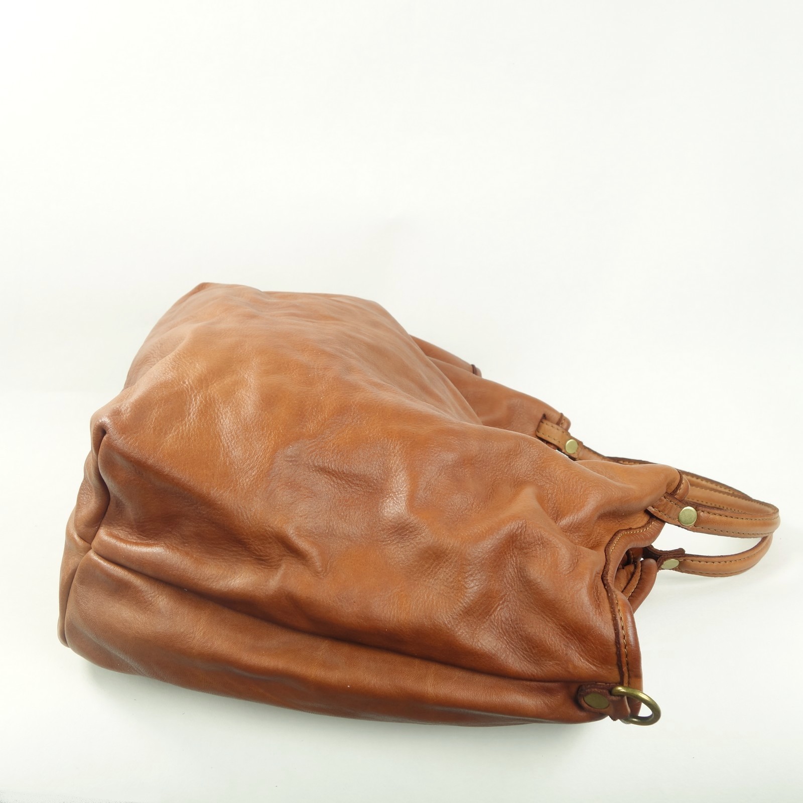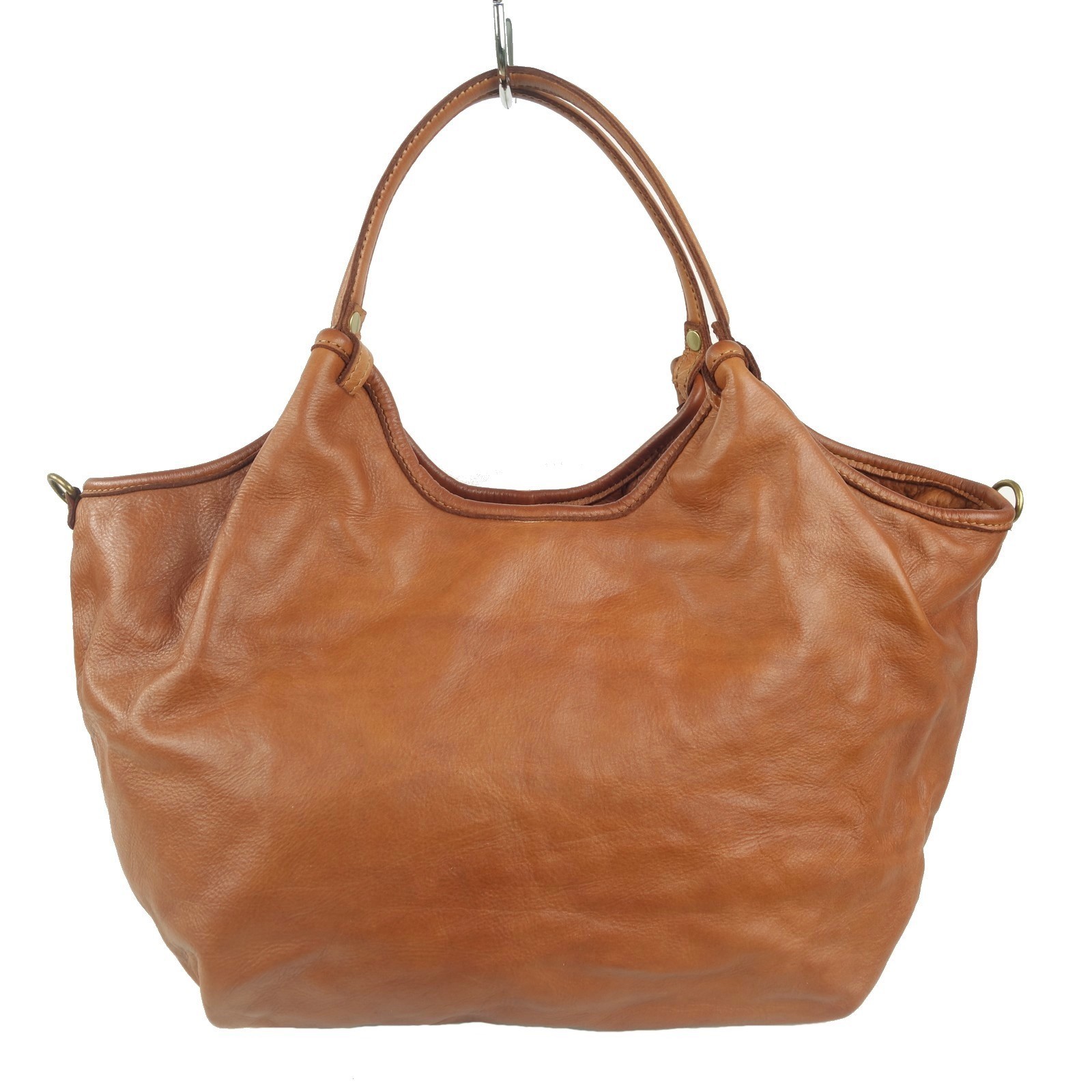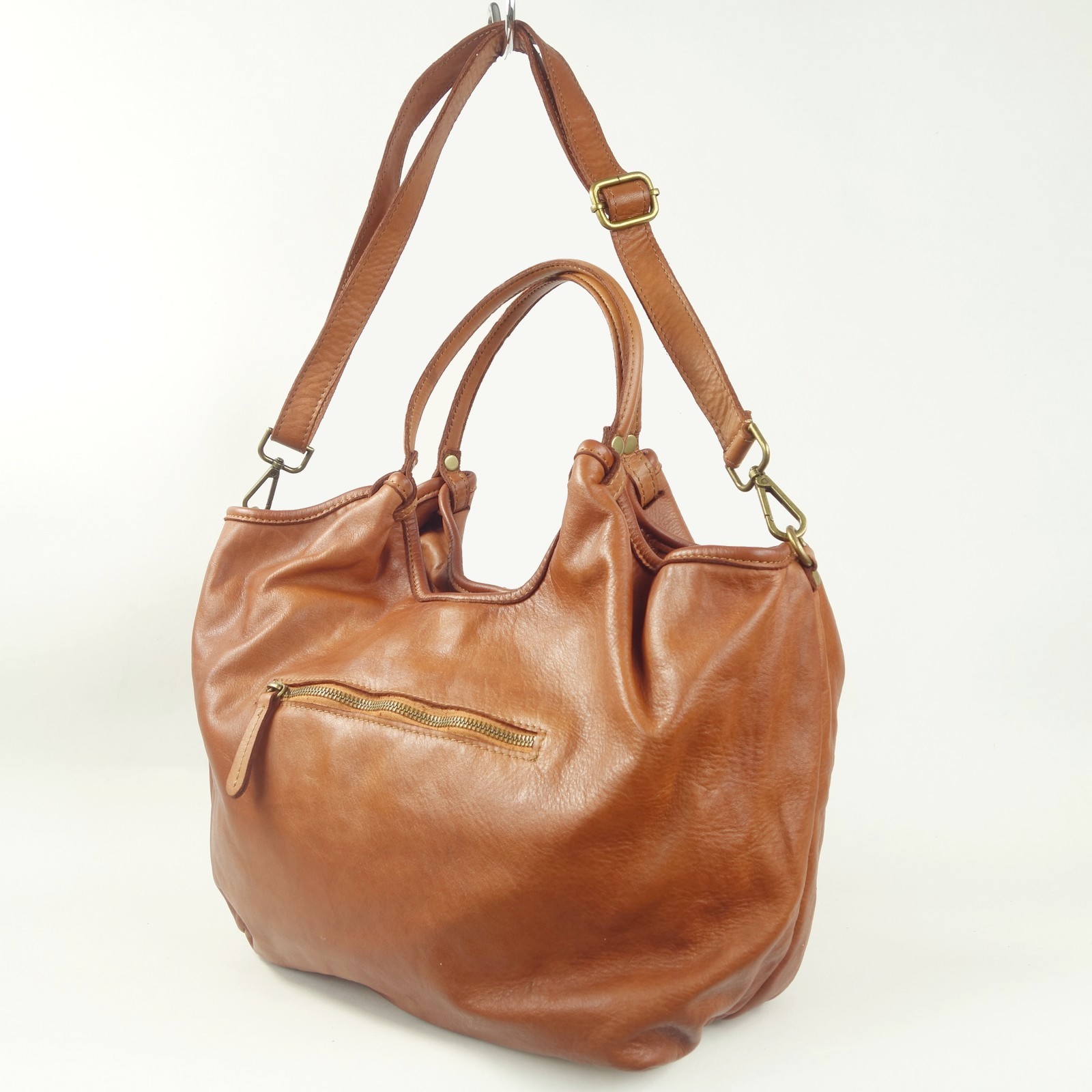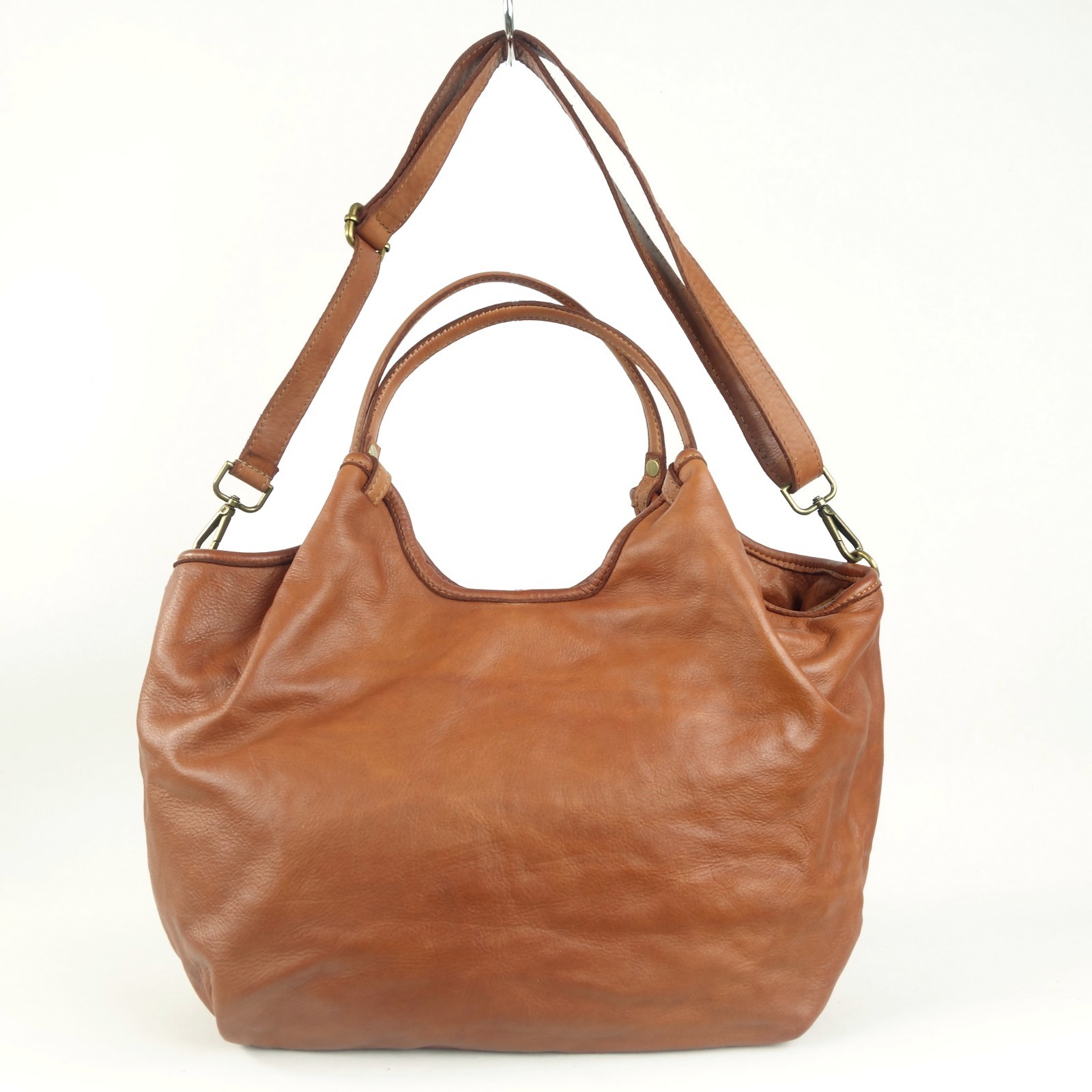 Si vous espérez du charme et de la belle qualité pour votre prochain sac à main, ce modèle de grand sac porté épaule ou en bandoulière en cuir souple vieilli couleur cognac pourrait bien vous séduire.