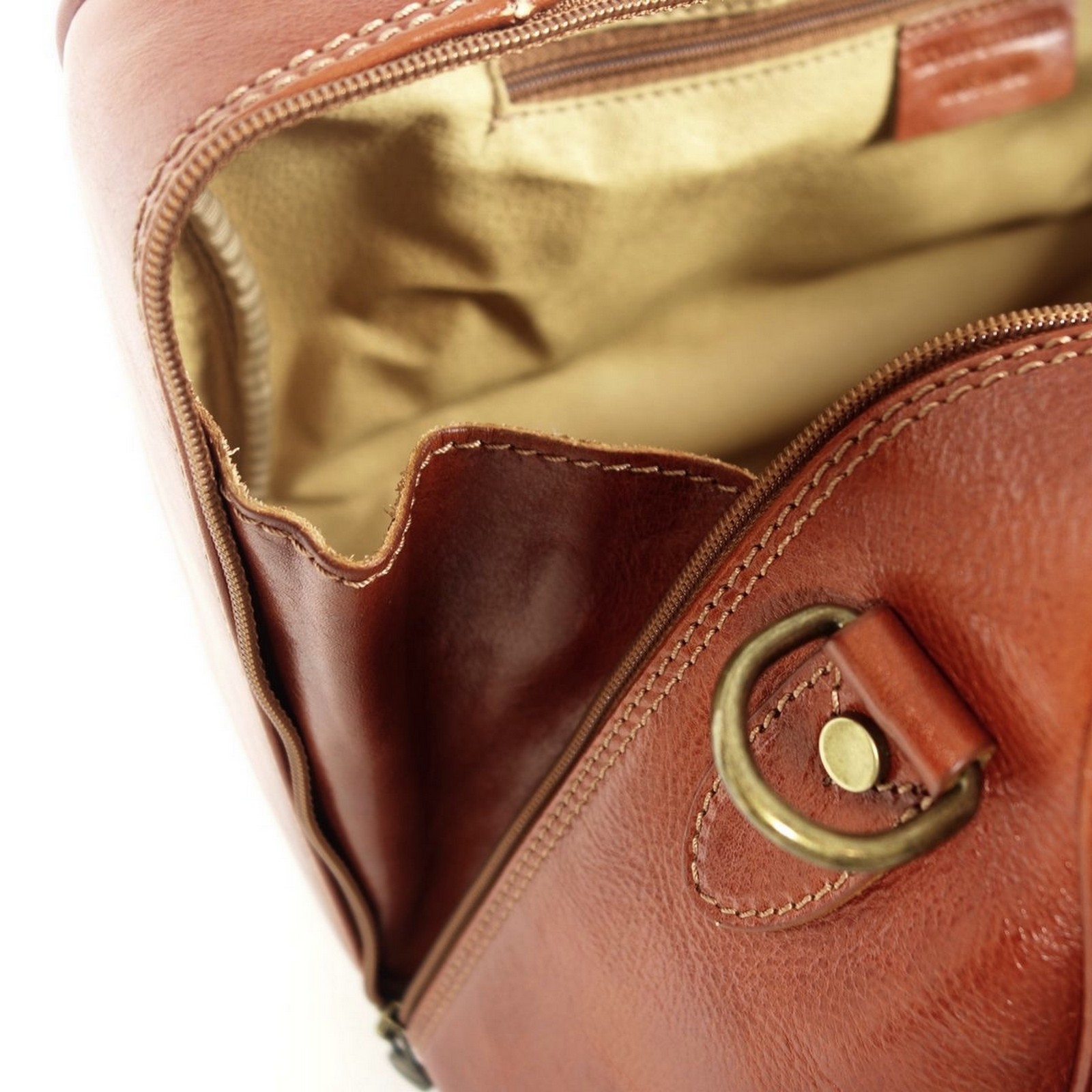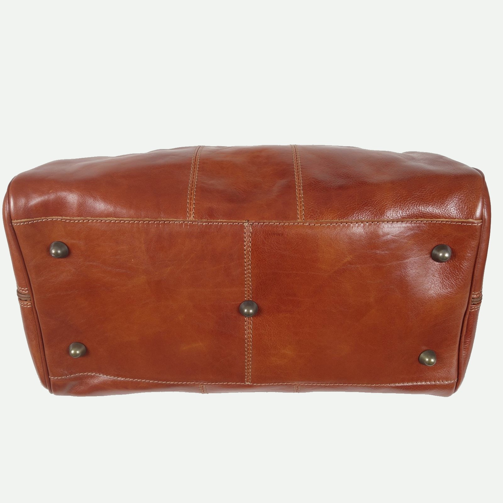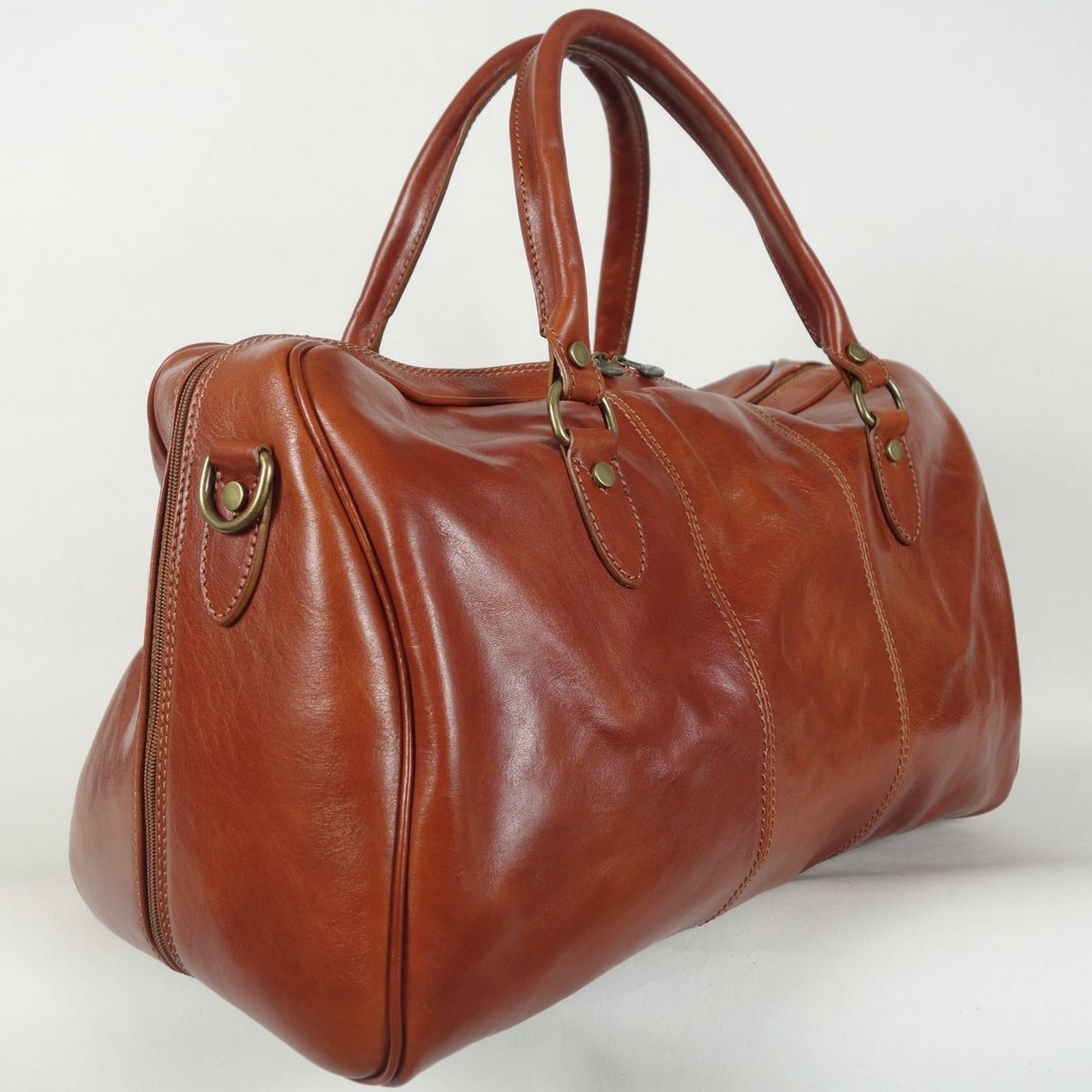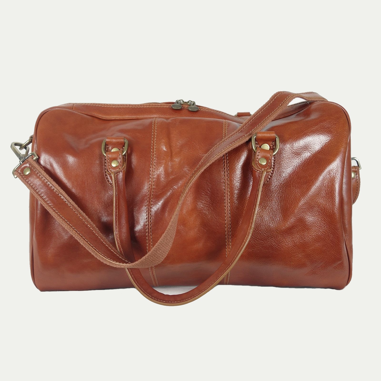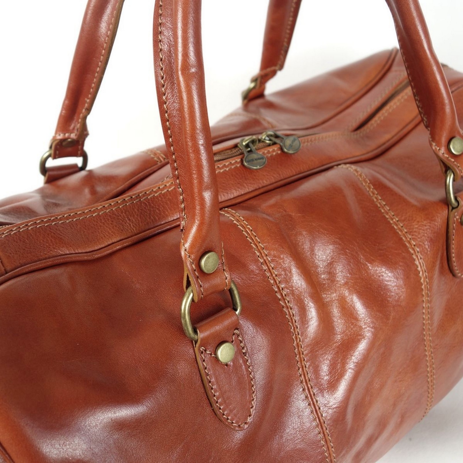 Ce superbe sac de voyage pour femme en cuir ciré couleur cognac propose d’abord une ligne sobre dotée d’une certaine classe.