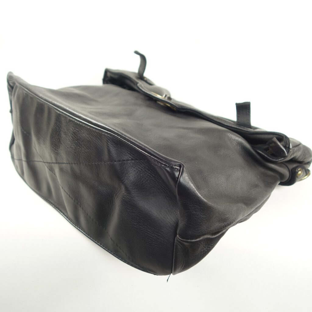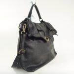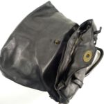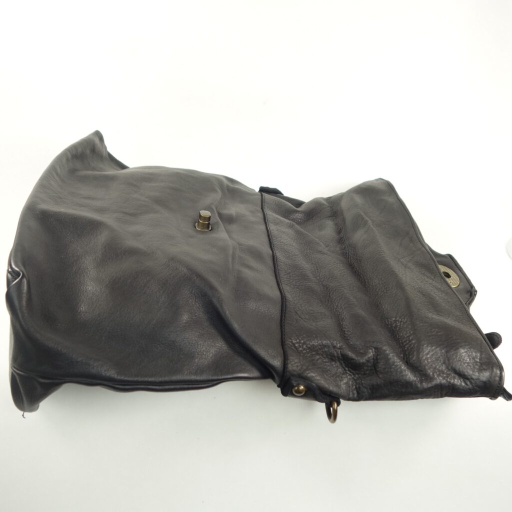 Sorte de grande besace portée main, épaule ou en bandoulière, son rabat agencé dans le corps même du sac (partie haute repliée) se ferme avec un gros fermoir rotatif en métal couleur laiton vieilli.