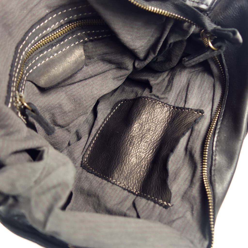 Une fois levé le rabat, une fermeture éclair donne accès à l’intérieur du sac, très spacieux, qui comporte deux poches dont une à zip.