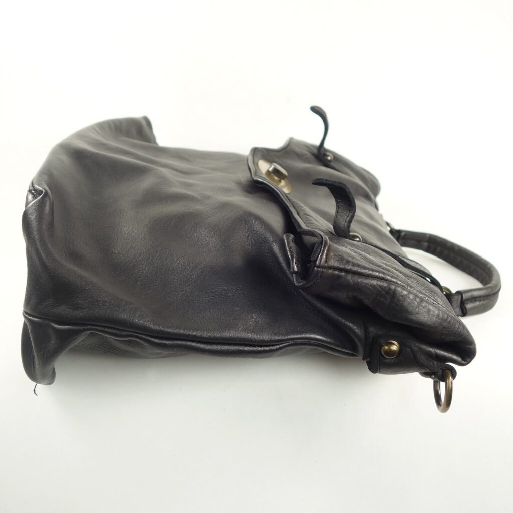 Côté utile, on portera ce sac par la anse en cuir et articulée sur anneaux métal. Avec ses 14 cm de passage de bras, ce  sera très juste pour le glisser à l’épaule, excepté peut être pour les plus minces ou alors pour les autres, sans veste ou manteau.
